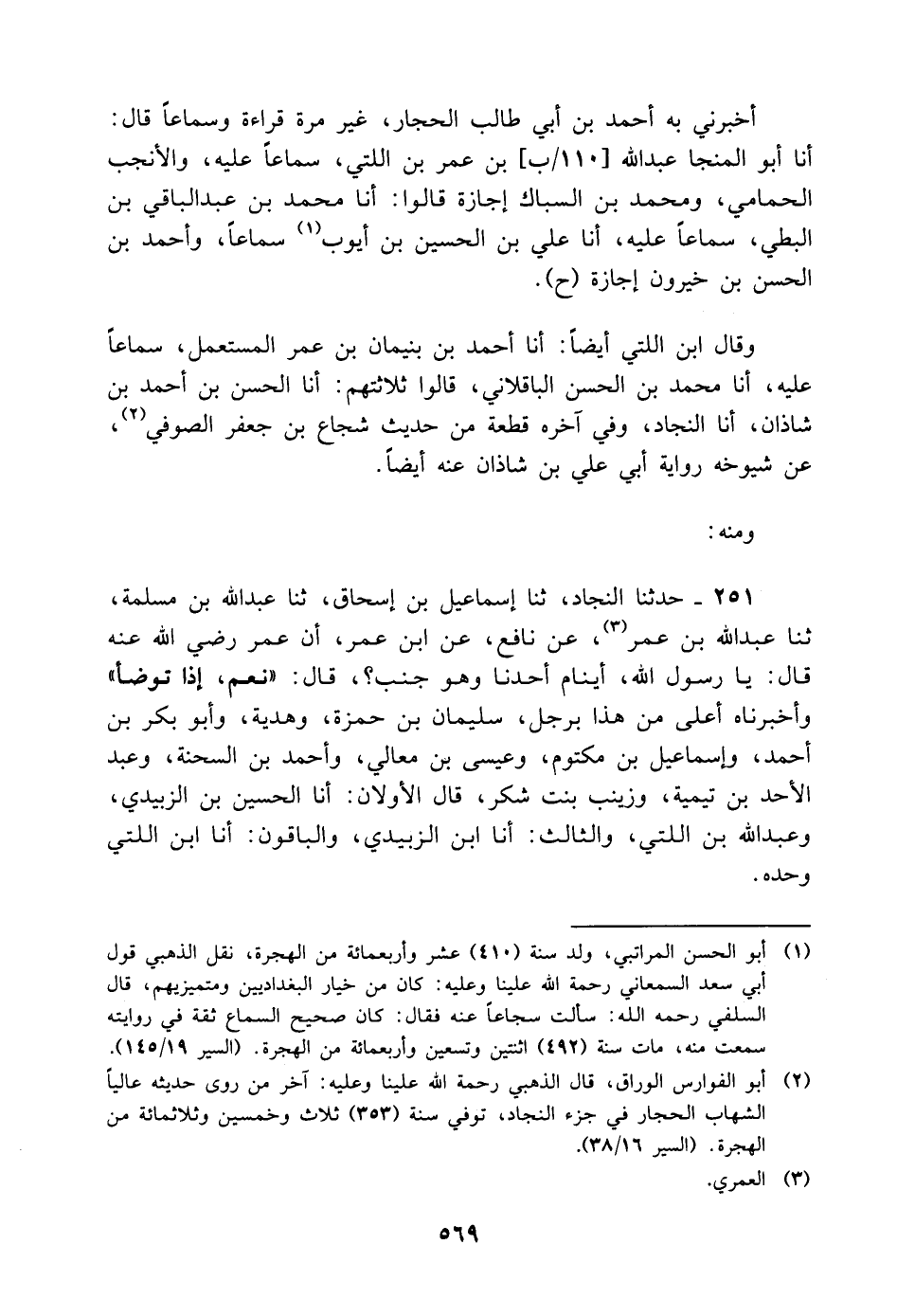 أخبرني به أحمد بن أبي طالب الحجار، غير مرة قراءة وسماعا قال: أنا أبو المنجا عبد الله بن عمر بن اللتي، سماعا عليه، والأنجب الحمامي، وَمُحَمَّد بن السباك إجازة قالوا: أنا مُحَمَّد بن عبد الباقي بن البطي، سماعا عليه، أنا علي بن الحسين بن أيوب سماعا، وأحمد بن الحسن بن خيرون إجازة، ح وقال ابن اللتي أيضا: أنا أحمد بن بنيمان بن عمر المستعمل، سماعا عليه، أنا مُحَمَّد بن الحسن الباقلاني، قالوا ثلاثتهم: أنا الحسن بن أحمد بن شاذان، أنا النجاد، وفي آخره قطعة من حديث شجاع بن جعفر الصوفي، عن شيوخه رواية أبي علي بن شاذان عنه أيضا ومنه: