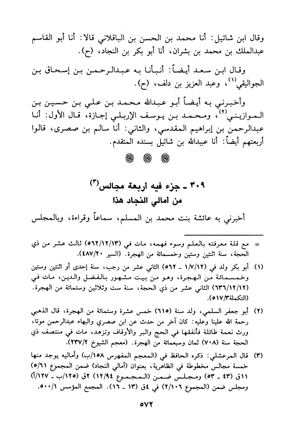 أبو بكر بن النجاد، ح وقال ابن سعد أيضا: أنبأنا به عبد الرحمن بن إسحاق بن الجواليقي، وعبد العزيز بن دلف، ح وأخبرني به أيضا أبو عبد الله مُحَمَّد بن علي بن حسين بن الموازيني، وَمُحَمَّد بن يوسف الإربلي إجازة، قال الأول: أنا عبد الرحمن بن إبراهيم المقدسي، والثاني: أنا سالم بن صصرى، قالوا أربعتهم أيضا: أنا عبيد الله بن شاتيل بسنده المتقدم
