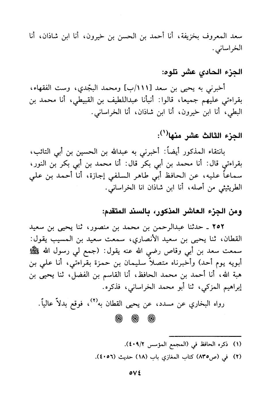 أخبرني به يحيى بن سعد وَمُحَمَّد البجدي، وست الفقهاء، بقراءتي عليهم جميعا، قالوا: أنبأنا عبد اللطيف بن القبيطي، أنا مُحَمَّد بن البطي، أنا ابن خيرون، أنا ابن شاذان، أنا الخراساني