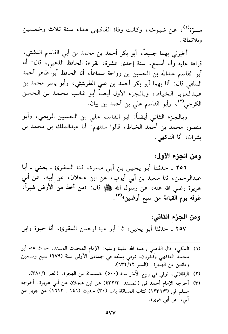 مسرة، عن شيوخه، وكانت وفاة الفاكهي هذا، سنة ثلاث وخمسين وثلاث مائة أخبرني بهما جميعا، أبو بكر أحمد بن مُحَمَّد بن أبي القاسم الدشتي، قراءة عليه وأنا أسمع، سنة إحدى عشرة، بقراءة الحافظ الذهبي، قال: أنا أبو القاسم عبد الله بن الحسين بن رواحة سماعا، أنا الحافظ أبو طاهر أحمد السلفي قال: أنا بهما أبو بكر أحمد بن علي الطريثيثي، وأبو ياسر مُحَمَّد بن عبد العزيز الخياط، وبالجزء الأول أيضا أبو غالب مُحَمَّد بن الحسن الكرجي، وأبو القاسم علي بن أحمد بن بيان وبالجزء الثاني أيضا: أبو القاسم علي بن الحسين الربعي، وأبو منصور مُحَمَّد بن أحمد الخياط، قالوا ستتهم: أنا عبد الملك بن مُحَمَّد بن بشران، أنا الفاكهي