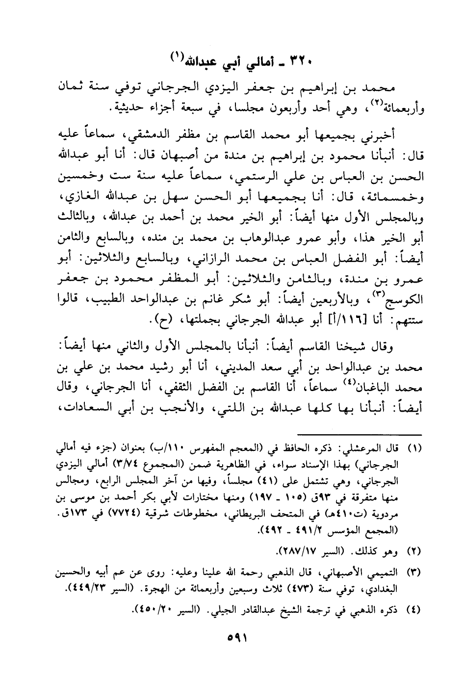 محمد بن إبراهيم بن جعفر اليزدي الجرجاني توفي سنة ثمان وأربع مائة، وهي أحد وأربعون مجلسا، في سبعة أجزاء حديثية أخبرني بجميعها أبو مُحَمَّد القاسم بن مظفر الدمشقي، سماعا عليه قال: أنبأنا محمود بن إبراهيم بن منده من أصبهان قال: أنا أبو عبد الله الحسن بن العباس بن علي الرستمي، سماعا عليه سنة ست وخمسين وخمس مائة، قال: أنا بجميعها أبو الحسن سهل بن عبد الله الغازي، وبالمجلس الأول منها أيضا: أبو الخير مُحَمَّد بن أحمد بن عبد الله، وبالثالث أبو الخير هذا، وأبو عمرو عبد الوهاب بن مُحَمَّد بن منده، وبالسابع والثامن أيضا: أبو الفضل العباس بن مُحَمَّد الرازاني، وبالسابع والثلاثين: أبو عمرو بن منده، وبالثامن والثلاثين: أبو المظفر محمود بن جعفر الكوسج، وبالأربعين أيضا: أبو شكر غانم بن عبد الواحد الطبيب، قالوا ستتهم: أنا أبو عبد الله الجرجاني بجملتها، ح وقال شيخنا القاسم أيضا: أنبأنا بالمجلس الأول والثاني منها أيضا: مُحَمَّد بن عبد الواحد بن أبي سعد المديني، أنا أبو رشيد مُحَمَّد بن علي بن مُحَمَّد الباغبان سماعا، أنا القاسم بن الفضل الثقفي، أنا الجرجاني، وقال أيضا: أنبأنا بها كلها عبد الله بن اللتي، والأنجب بن أبي السعادات،