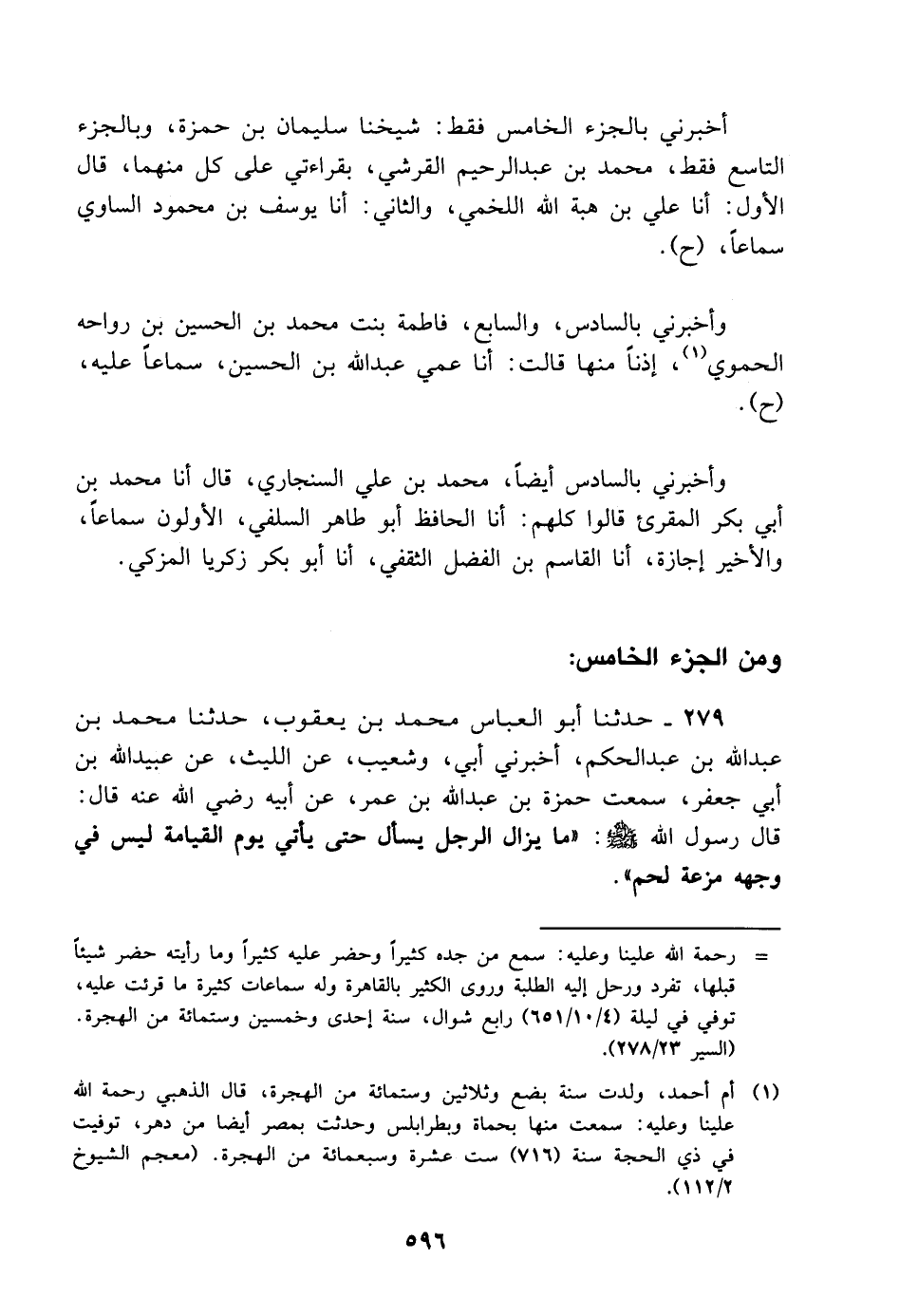أخبرني بالجزء الخامس فقط: شيخنا سليمان بن حمزة، وبالجزء التاسع فقط، مُحَمَّد بن عبد الرحيم القرشي، بقراءتي على كل منهما، قال الأول: أنا علي بن هبة الله اللخمي، والثاني: أنا يوسف بن محمود الساوي سماعا، ح وأخبرني بالسادس، والسابع، فاطمة بنت مُحَمَّد بن الحسين بن رواحة الحموي، إذنا منها قالت: أنا عمي عبد الله بن الحسين، سماعا عليه، ح وأخبرني بالسادس أيضا، مُحَمَّد بن علي السنجاري، قال أنا مُحَمَّد بن أبي بكر المقرئ قالوا كلهم: أنا الحافظ أبو طاهر السلفي، الأولون سماعا، والأخير إجازة، أنا القاسم بن الفضل الثقفي، أنا أبو بكر زكريا المزكي