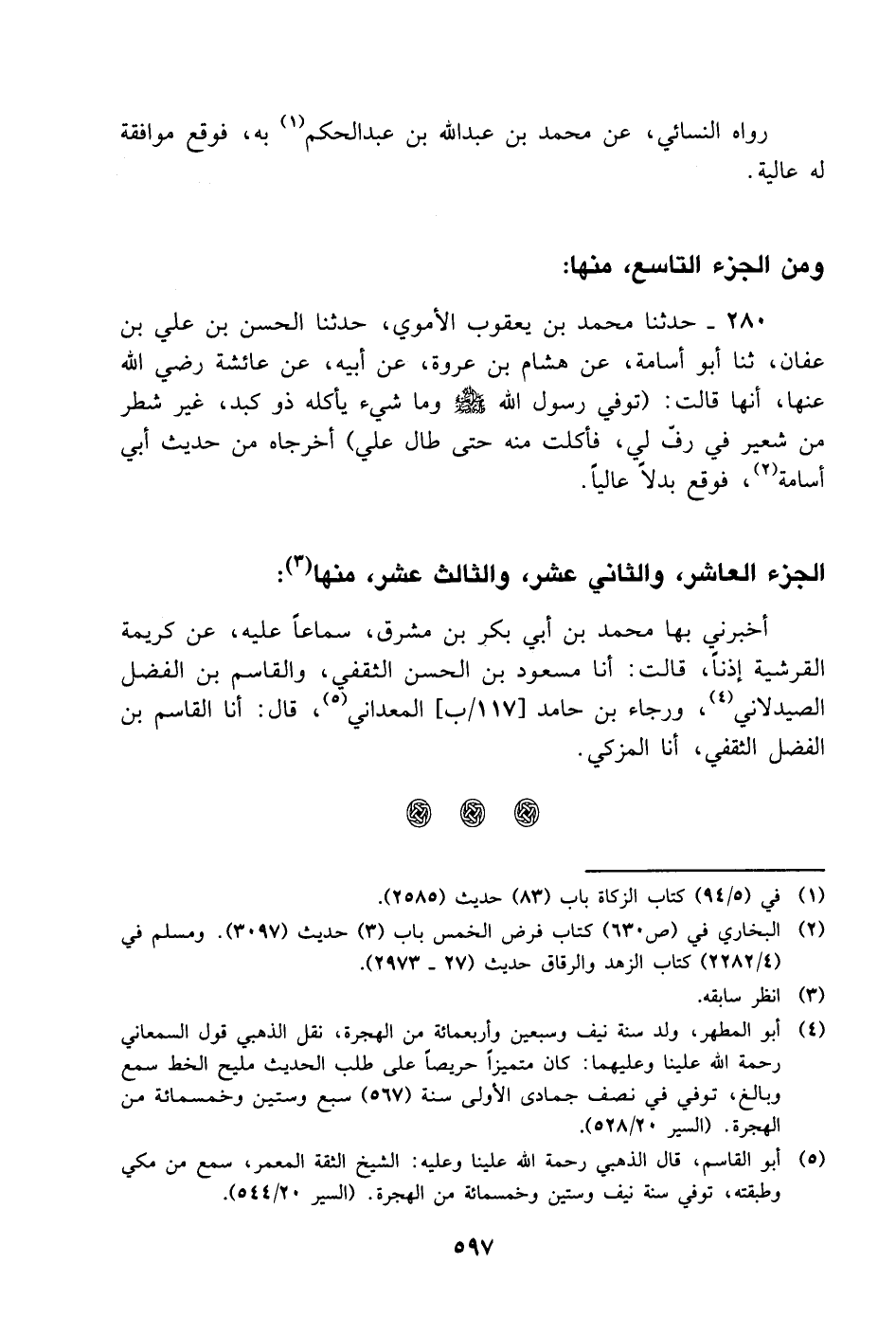 280 - حَدَّثَنَا مُحَمَّدُ بْنُ يَعْقُوبَ الأُمَوِيُّ، حَدَّثَنَا الْحَسَنُ بْنُ عَلِيِّ بْنِ عَفَّانَ، ثنا أَبُو أُسَامَةَ، عَنْ هِشَامِ بْنِ عُرْوَةَ، عَنْ أَبِيهِ، عَنْ عَائِشَةَ، رَضِيَ اللَّهُ عَنْهَا، أَنَّهَا قَالَتْ: " تُوُفِّيَ رَسُولُ اللَّهِ، صَلَّى اللَّهُ عَلَيْهِ وَسَلَّمَ، وَمَا شَيْءٌ يَأْكُلُه ذُو كَبِدٍ، غَيْرُ شَطْرٍ مِنْ شَعِيرٍ فِي رَفٍّ لِي، فَأَكَلْتُ مِنْهُ حَتَّى طَالَ عَلَيَّ " أَخْرَجَاهُ مِنْ حَدِيثِ أَبِي أُسَامَةَ، فَوَقَعَ بَدَلا عَالِيًا