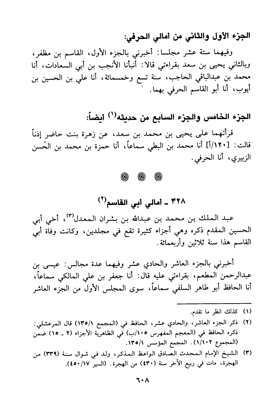 عبد الملك بن مُحَمَّد بن عبد الله بن بشران المعدل، أخي أبي الحسين المقدم ذكره وهي أجزاء كثيرة تقع في مجلدين، وكانت وفاة أبي القاسم هذا سنة ثلاثين وأربع مائة أخبرني بالجزء العاشر والحادي عشر وفيهما عدة مجالس: عيسى بن عبد الرحمن المطعم، بقراءتي عليه قال: أنا جعفر بن علي المالكي سماعا، أنا الحافظ أبو طاهر السلفي سماعا، سوى المجلس الأول من الجزء العاشر