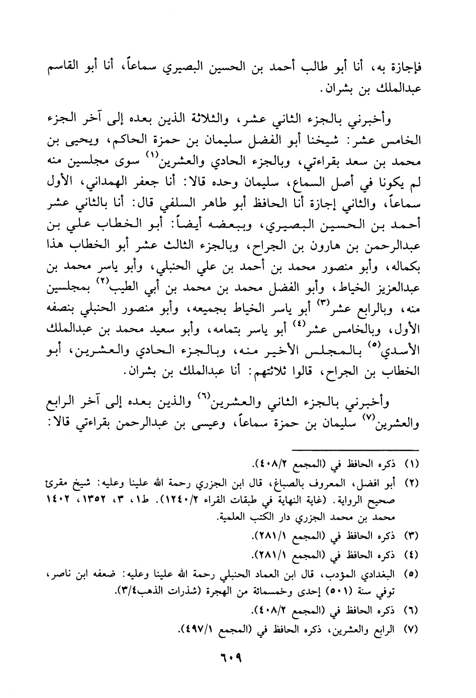 فإجازة به، أنا أبو طالب أحمد بن الحسين البصيري سماعا، أنا أبو القاسم عبد الملك بن بشران وأخبرني بالجزء الثاني عشر، والثلاثة الذين بعده إلى آخر الجزء الخامس عشر: شيخنا أبو الفضل سليمان بن حمزة الحاكم، ويحيى بن مُحَمَّد بن سعد بقراءتي، وبالجزء الحادي والعشرين سوى مجلسين منه لم يكونا في أصل السماع، سليمان وحده قالا: أنا جعفر الهمداني، الأول سماعا، والثاني إجازة أنا الحافظ أبو طاهر السلفي، قال: أنا بالثاني عشر أحمد بن الحسين البصيري، وببعضه أيضا: أبو الخطاب علي بن عبد الرحمن بن هارون بن الجراح، وبالجزء الثالث عشر أبو الخطاب هذا بكماله، وأبو منصور مُحَمَّد بن أحمد بن علي الحنبلي، وأبو ياسر مُحَمَّد بن عبد العزيز الخياط، وأبو الفضل مُحَمَّد بن مُحَمَّد بن أبي الطيب بمجلسين منه، وبالرابع عشر أبو ياسر الخياط بجميعه،