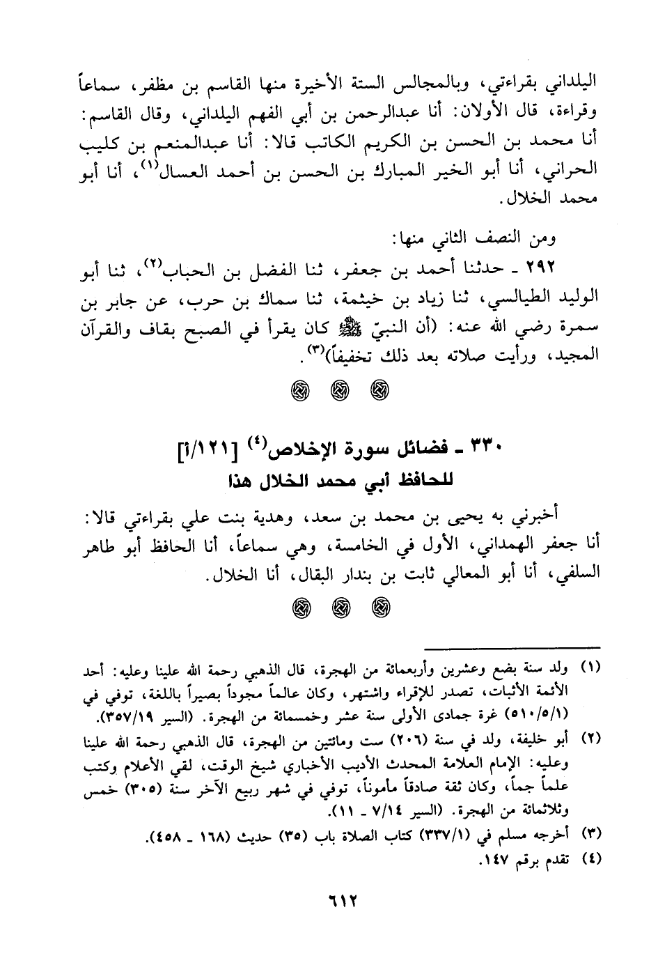 أخبرني به يحيى بن مُحَمَّد بن سعد، وهدية بنت علي بقراءتي قالا: أنا جعفر الهمداني، الأول في الخامسة، وهي سماعا، أنا الحافظ أبو طاهر السلفي، أنا أبو المعالي ثابت بن بندار البقال، أنا الخلال