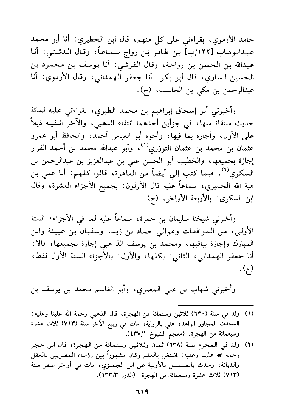 الله بن الحسن بن رواحة، وقال القرشي: أنا يوسف بن محمود بن الحسين الساوي، قال أبو بكر: أنا جعفر الهمداني، وقال الأرموي: أنا عبد الرحمن بن مكي بن الحاسب، ح وأخبرني أبو إسحاق إبراهيم بن مُحَمَّد الطبري، بقراءتي عليه لمائة حديث منتقاة منها، في جزأين أحدهما انتقاء الذهبي، والآخر انتقيته ذيلا على الأول، وأجازه بما فيها، وأخوه أبو العباس أحمد، والحافظ أبو عمرو عثمان بن مُحَمَّد بن عثمان التوزري، وأبو عبد الله مُحَمَّد بن أحمد القزاز إجازة بجميعها، والخطيب أبو الحسن علي بن عبد العزيز بن عبد الرحمن بن السكري، فيما كتب إلي أيضا من القاهرة، قالوا كلهم: أنا علي بن هبة الله الحميري، سماعا عليه قال الأولون: بجميع الأجزاء العشرة، وقال ابن السكري: بالأربعة الأواخر، ح وأخبرني شيخنا سليمان بن حمزة، سماعا عليه لما في الأجزاء الستة الأولى، من الموافقات وعوالي حماد بن زيد، وسفيان بن عيينة وابن المبارك وإجازة بباقيها، وَمُحَمَّد بن يوسف الذهبي إجازة بجميعها، قالا: أنا جعفر الهمداني، الثاني: بكلها، والأول: بالأجزاء الستة الأول فقط، ح وأخبرني شهاب بن علي المصري، وأبو القاسم مُحَمَّد بن يوسف بن