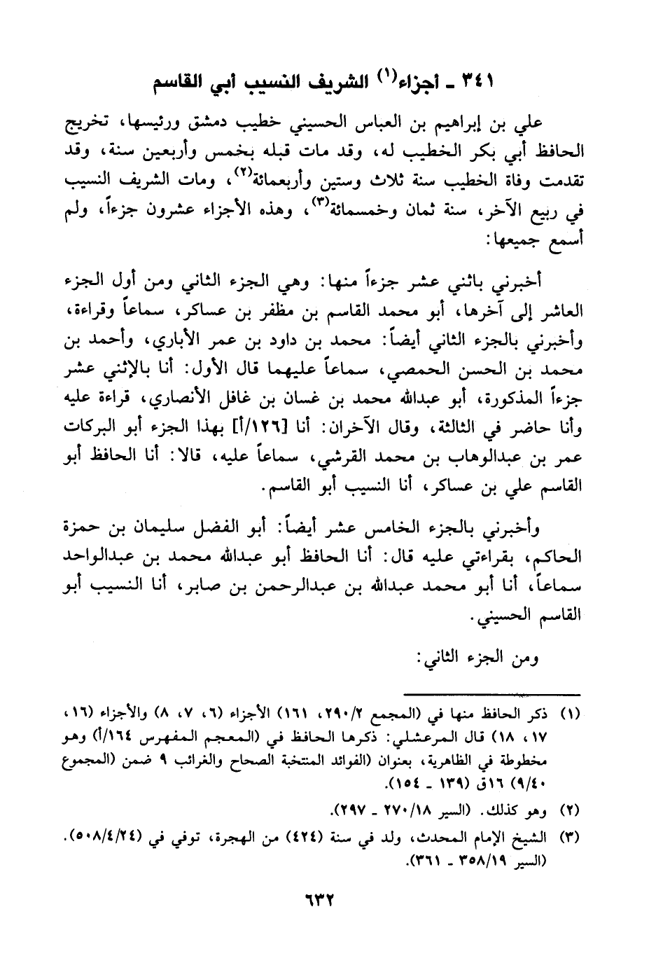 علي بن إبراهيم بن العباس الحسيني خطيب دمشق ورئيسها، تخريج الحافظ أبي بكر الخطيب له، وقد مات قبله بخمس وأربعين سنة، وقد تقدمت وفاة الخطيب سنة ثلاث وستين وأربع مائة، ومات الشريف النسيب في ربيع الآخر، سنة ثمان وخمس مائة، وهذه الأجزاء عشرون جزءا، ولم أسمع جميعها: أخبرني باثني عشر جزءا منها: وهي الجزء الثاني ومن أول الجزء العاشر إلى آخرها، أبو مُحَمَّد القاسم بن مظفر بن عساكر، سماعا وقراءة، وأخبرني بالجزء الثاني أيضا: مُحَمَّد بن داود بن عمر الأباري، وأحمد بن مُحَمَّد بن الحسن الحمصي، سماعا عليهما قال الأول: أنا بالإثني عشر جزءا المذكورة، أبو عبد الله مُحَمَّد بن غسان بن غافل الأنصاري، قراءة عليه وأنا حاضر في الثالثة، وقال الآخران: أنا بهذا الجزء أبو البركات عمر بن عبد الوهاب بن مُحَمَّد القرشي، سماعا عليه، قالا: أنا الحافظ أبو القاسم علي بن عساكر، أنا النسيب أبو القاسم وأخبرني بالجزء الخامس عشر أيضا: أبو الفضل سليمان بن حمزة الحاكم، بقراءتي عليه قال: أنا الحافظ أبو عبد الله مُحَمَّد بن عبد الواحد سماعا، أنا أبو مُحَمَّد عبد الله بن عبد الرحمن بن صابر، أنا النسيب أبو القاسم الحسيني ومن الجزء الثاني: