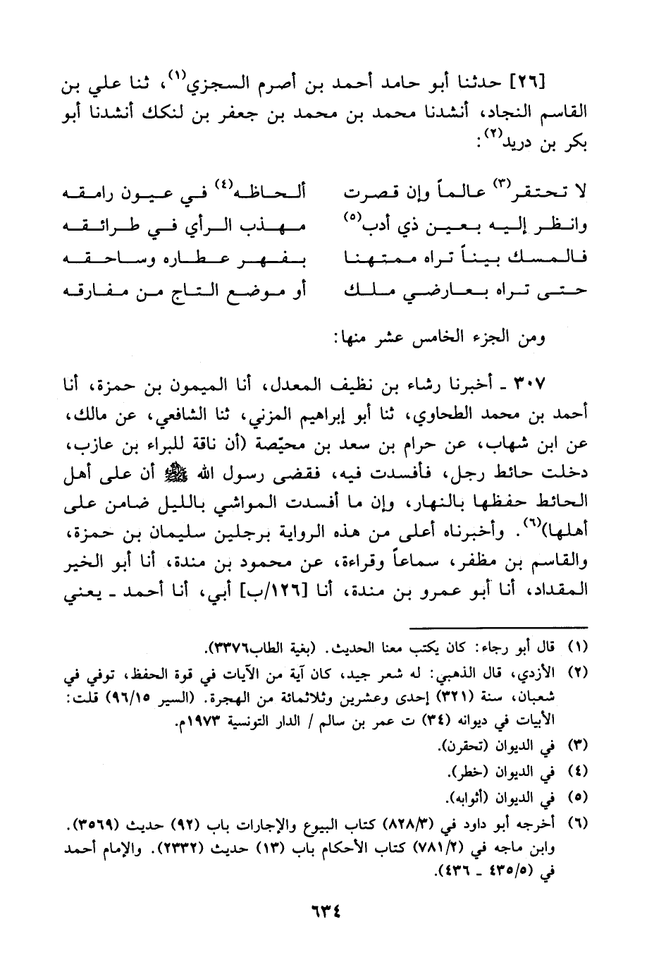 307 - أَخْبَرَنَا رَشَاءُ بْنُ نَظِيفٍ الْمُعَدَّلُ، أنا الْمَيْمُونُ بْنُ حَمْزَةَ، أنا أَحْمَدُ بْنُ مُحَمَّدٍ الطَّحَاوِيُّ، ثنا أَبُو إِبْرَاهِيمَ الْمُزَنِيُّ، ثنا الشَّافِعِيُّ، عَنْ مَالِكٍ، عَنِ ابْنِ شِهَابٍ، عَنْ حَرَامِ بْنِ سَعْدِ بْنِ مُحَيِّصَةَ: أَنَّ نَاقَةً لِلْبَرَاءِ بْنِ عَازِبٍ دَخَلَتْ حَائِطَ رَجُلٍ، فَأَفْسَدَتْ فِيهِ، فَقَضَى رَسُولُ اللَّهِ، صَلَّى اللَّهُ عَلَيْهِ وَسَلَّمَ، أَنَّ " عَلَى أَهْلِ الْحَائِطِ حِفْظَهَا بِالنَّهَارِ، وَأَنَّ مَا أَفْسَدَتِ الْمَوَاشِي بِاللَّيْلِ ضَامِنٌ عَلَى أَهْلِهَا " وَأَخْبَرَنَاهُ أَعْلَى مِنْ هَذِهِ الرِّوَايَةِ بِرَجُلَيْنِ سُلَيْمَانُ بْنُ حَمْزَةَ، وَالْقَاسِمُ بْنُ مُظَفَّرٍ، سَمَاعًا وَقِرَاءَةً، عَنْ مَحْمُودِ بْنِ مَنْدَهْ، أنا أَبُو الْخَيْرِ الْمِقْدَادُ، أنا أَبُو عَمْرِو بْنُ مَنْدَهْ، أنا أَبِي، أنا أَحْمَدُ، يَعْنِي: