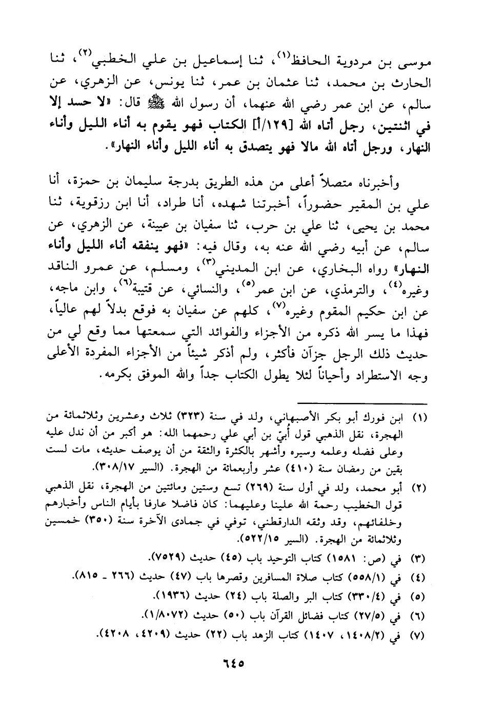 مُوسَى بْنُ مَرْدُوَيْهِ الْحَافِظُ، ثنا إِسْمَاعِيلُ بْنُ عَلِيٍّ الْخُطَبِيُّ، ثنا الْحَارِثُ بْنُ مُحَمَّدٍ، ثنا عُثْمَانُ بْنُ عُمَرَ، ثنا يُونُسُ، عَنِ الزُّهْرِيِّ، عَنْ سَالِمٍ، عَنِ ابْنِ عُمَرَ، رَضِيَ اللَّهُ عَنْهُمَا، أَنَّ رَسُولَ اللَّهِ، صَلَّى اللَّهُ عَلَيْهِ وَسَلَّمَ، قَالَ: " لا حَسَدَ إِلا فِي اثْنَتَيْنِ رَجُلٌ أَتَاهُ اللَّهُ الْكِتَابَ فَهُوَ يَقُومُ بِهِ آنَاءَ اللَّيْلِ وَآنَاءَ النَّهَارِ، وَرَجُلٌ أَتَاهُ اللَّهُ مَالا فَهُوَ يَتَصَدَّقُ بِهِ آنَاءَ اللَّيْلِ وَآنَاءَ النَّهَارِ " وَأَخْبَرَنَاهُ مُتَّصِلا أَعْلَى مِنْ هَذِهِ الطَّرِيقِ بِدَرَجَةٍ سُلَيْمَانُ بْنُ حَمْزَةَ، أنا عَلِيُّ بْنُ الْمُقَيَّرِ، حُضُورًا، أَخْبَرَتْنَا شُهْدَةُ، أنا طِرَادٌ، أنا ابْنُ رِزْقَوَيْهِ، ثنا مُحَمَّدُ بْنُ يَحْيَى، ثنا عَلِيُّ بْنُ حَرْبٍ، ثنا سُفْيَانُ بْنُ عُيَيْنَةَ، عَنِ الزُّهْرِيِّ، عَنْ سَالِمٍ، عَنْ أَبِيهِ، رَضِيَ اللَّهُ عَنْهُ، بِهِ، وَقَالَ فِيهِ: " فَهُوَ يُنْفِقُهُ آنَاءَ اللَّيْلِ وَآنَاءَ النَّهَارِ " رَوَاهُ الْبُخَارِيُّ، عَنِ ابْنِ الْمَدِينِيِّ وَمُسْلِمٌ، عَنْ عَمْرٍو النَّاقِدِ، وَغَيْرِهِ وَالتِّرْمِذِيُّ، عَنِ ابْنِ عُمَرَ وَالنَّسَائِيُّ، عَنْ قُتَيْبَةَ وَابْنُ مَاجَهْ، عَنِ ابْنِ حَكِيمٍ الْمُقَوِّمِ، وَغَيْرِهِ، كُلُّهُمْ عَنْ سُفْيَانَ، بِهِ، فَوَقَعَ بَدَلا لَهُمْ عَالِيًا، فَهَذَا مَا يَسَّرَ اللَّهُ ذِكْرَهُ مِنَ الأَجْزَاءِ وَالْفَوَائِدِ الَّتِي سَمِعْتُهَا مِمَّا وَقَعَ لِي مِنْ حَدِيثِ ذَلِكَ الرَّجُلِ جُزْآنِ فَأَكْثَرُ، وَلَمْ أَذْكُرْ شَيْئًا مِنَ الأَجْزَاءِ الْمُفْرَدَةِ إِلا عَلَى وَجْهِ الاسْتِطْرَادِ، وَأَحْيَانًا لِئَلا يَطُولَ الْكِتَابُ جِدًّا، وَاللَّهُ الْمُوَفِّقُ بِكَرَمِهِ