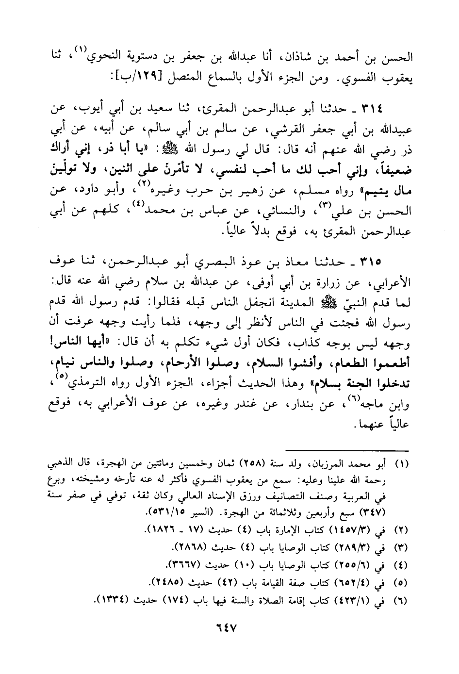 الحسن بن أحمد بن شاذان، أنا عبد الله بن جعفر بن دستوية النحوي، ثنا يعقوب الفسوي ومن الجزء الأول بالسماع المتصل: