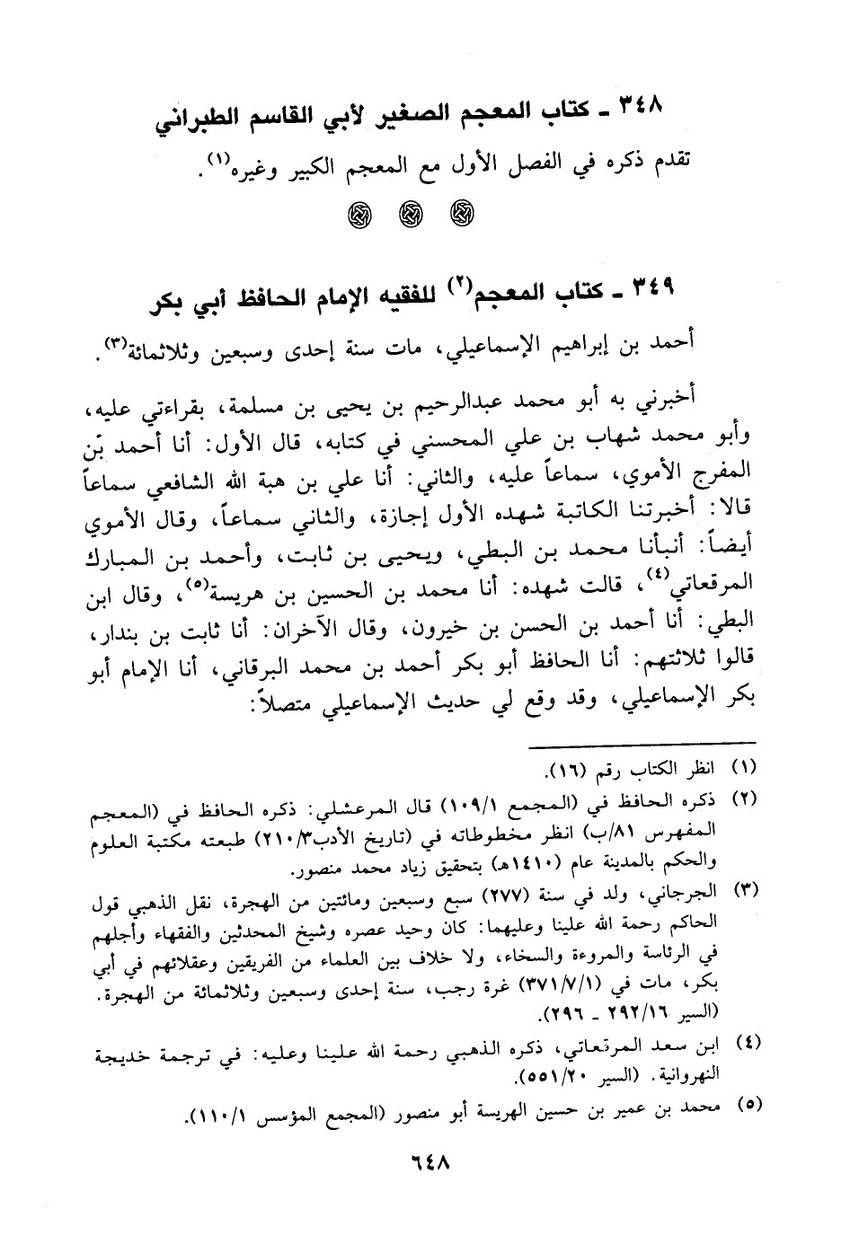 أحمد بن إبراهيم الإسماعيلي، مات سنة إحدى وسبعن وثلاث مائة أخبرني به أبو مُحَمَّد عبد الرحيم بن يحيى بن مسلمة، بقراءتي عليه، وأبو مُحَمَّد شهاب بن علي المحسني في كتابه، قال الأول: أنا أحمد بن المفرج الأموي، سماعا عليه، والثاني: أنا علي بن هبة الله الشافعي سماعا قالا: أخبرتنا الكاتبة شهدة، الأول إجازة، والثاني سماعا، وقال الأموي أيضا: أنبأنا مُحَمَّد بن البطي، ويحيى بن ثابت، وأحمد بن المبارك المرقعاتي، قالت شهدة: أنا مُحَمَّد بن الحسين بن هريسة، وقال ابن البطي: أنا أحمد بن الحسن بن خيرون، وقال الآخران: أنا ثابت بن بندار، قالوا ثلاثتهم: أنا الحافظ أبو بكر أحمد بن مُحَمَّد البرقاني، أنا الإمام أبو بكر الإسماعيلي، وقد وقع لي حديث الإسماعيلي متصلا: