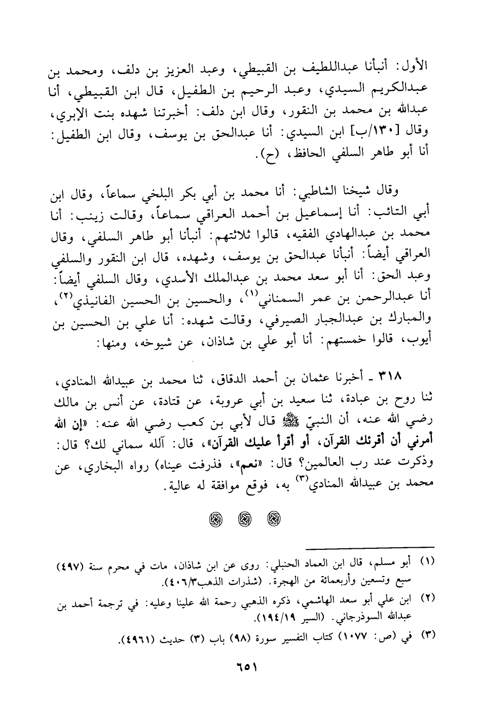 الأول: أنبأنا عبد اللطيف بن القبيطي، وعبد العزيز بن دلف، وَمُحَمَّد بن عبد الكريم السيدي، وعبد الرحيم بن الطفيل، قال ابن القبيطي: أنا عبد الله بن مُحَمَّد بن النقور، وقال ابن دلف: أخبرتنا شهدة بنت الإبري، وقال ابن السيدي: أنا عبد الحق بن يوسف، وقال ابن الطفيل: أنا أبو طاهر السلفي الحافظ، ح وقال شيخنا الشاطبي: أنا مُحَمَّد بن أبي بكر البلخي سماعا، وقال ابن أبي التائب: أنا إسماعيل بن أحمد العراقي سماعا، وقالت زينب: أنا مُحَمَّد بن عبد الهادي الفقيه، قالوا ثلاثتهم: أنبأنا أبو طاهر السلفي، وقال العراقي أيضا: أنبأنا عبد الحق بن يوسف، وشهدة، قال ابن النقور والسلفي وعبد الحق: أنا أبو سعد مُحَمَّد بن عبد الملك الأسدي، وقال السلفي أيضا: أنا عبد الرحمن بن عمر السمناني، والحسين بن الحسين الفانيذي، والمبارك بن عبد الجبار الصيرفي، وقالت شهدة: أنا علي بن الحسين بن أيوب، قالوا خمستهم: