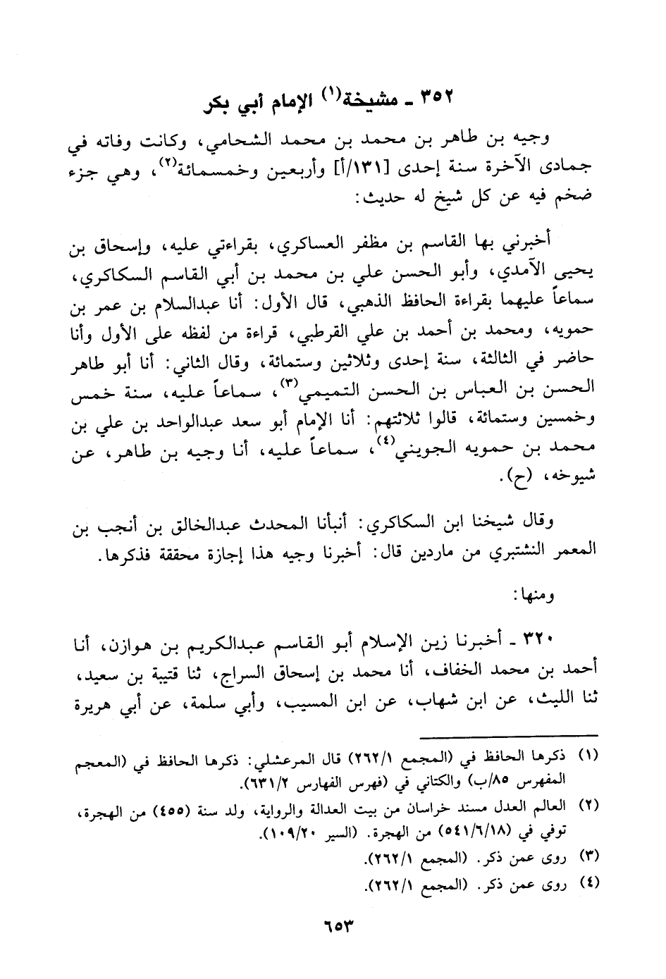 وجيه بن طاهر بن مُحَمَّد بن مُحَمَّد الشحامي، وكانت وفاته في جمادى الآخرة سنة إحدى وأربعين وخمس مائة، وهي جزء ضخم فيه عن كل شيخ له حديث: أخبرني بها القاسم بن مظفر العساكري، بقراءتي عليه، وإسحاق بن يحيى الآمدي، وأبو الحسن علي بن مُحَمَّد بن أبي القاسم السكاكري، سماعا عليهما بقراءة الحافظ الذهبي، قال الأول: أنا عبد السلام بن عمر بن حمويه، وَمُحَمَّد بن أحمد بن علي القرطبي، قراءة من لفظه على الأول، وأنا حاضر في الثالثة، سنة إحدى وثلاثين وست مائة، وقال الثاني: أنا أبو طاهر الحسن بن العباس بن الحسن التميمي، سماعا عليه، سنة خمس وخمسين وست مائة، قالوا: ثلاثتهم: أنا الإمام أبو سعد عبد الواحد بن علي بن مُحَمَّد بن حمويه الجويني، سماعا عليه، أنا وجيه بن طاهر، عن شيوخه ح وقال شيخنا ابن السكاكري: أنبأنا المحدث عبد الخالق بن أنجب بن المعمر النشتبري من ماردين قال: أخبرنا وجيه هذا إجازة محققة فذكرها ومنها: