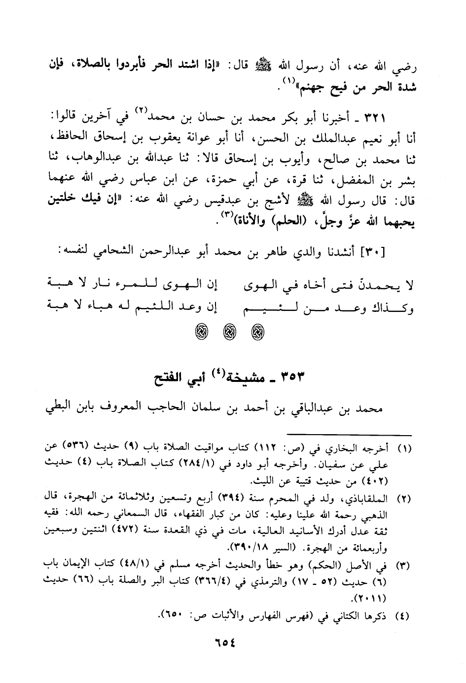 321 - أَخْبَرَنَا أَبُو بَكْرٍ مُحَمَّدُ بْنُ حَسَّانِ بْنِ مُحَمَّدٍ، فِي آخَرِينَ، قَالُوا: أنا أَبُو نُعَيْمٍ عَبْدُ الْمَلِكِ بْنُ الْحَسَنِ، أنا أَبُو عَوَانَةَ يَعْقُوبُ بْنُ إِسْحَاقَ الْحَافِظُ، ثنا مُحَمَّدُ بْنُ صَالِحٍ، وَأَيُّوبُ بْنُ إِسْحَاقَ، قالا: ثنا عَبْدُ اللَّهِ بْنُ عَبْدِ الْوَهَّابِ، ثنا بِشْرُ بْنُ الْمُفَضَّلِ، ثنا قُرَّةُ، عَنْ أَبِي حَمْزَةَ، عَنِ ابْنِ عَبَّاسٍ، رَضِيَ اللَّهُ عَنْهُمَا، قَالَ: قَالَ رَسُولُ اللَّهِ، صَلَّى اللَّهُ عَلَيْهِ وَسَلَّمَ، لأَشَجَّ بْنِ عَبْدِ قَيْسٍ، رَضِيَ اللَّهُ عَنْهُ: " إِنَّ فِيكَ خَلَّتَيْنِ يُحِبُّهَما اللَّهُ، عَزَّ وَجَلَّ الْحِلْمَ وَالأَنَاةَ " أنشدنا والدي طاهر بن مُحَمَّد أبو عبد الرحمن الشحامي لنفسه: