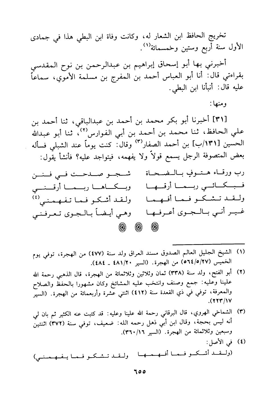 تخريج الحافظ ابن الشعار له، وكانت وفاة ابن البطي هذا في جمادى الأول سنة أربع وستين وخمس مائة أخبرني بها أبو إسحاق إبراهيم بن عبد الرحمن بن نوح المقدسي بقراءتي قال: أنا أبو العباس أحمد بن المفرج بن مسلمة الأموي، سماعا عليه قال: أنبأنا ابن البطي ومنها: