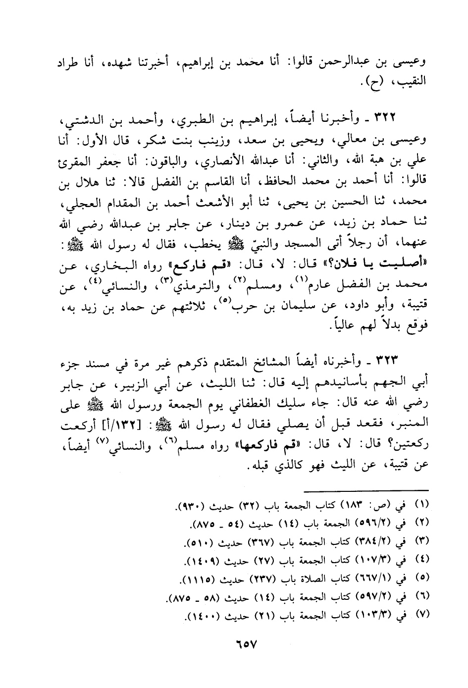 322 - وَأَخْبَرَنَا أَيْضًا، إِبْرَاهِيمُ بْنُ الطَّبَرِيِّ، وَأَحْمَدُ بْنُ الدَّشْتِيِّ، وَعِيسَى بْنُ مَعَالِي، وَيَحْيَى بْنُ سَعْدٍ، وَزَيْنَبُ بِنْتُ شُكْرٍ، قَالَ الأَوَّلُ: أنا عَلِيُّ بْنُ هِبَةِ اللَّهِ، وَالثَّانِي: أنا عَبْدُ اللَّهِ الأَنْصَارِيُّ، وَالْبَاقُونَ: أنا جَعْفَرٌ الْمُقْرِئُ، قَالُوا: أنا أَحْمَدُ بْنُ مُحَمَّدٍ الْحَافِظُ، أنا الْقَاسِمُ بْنُ الْفَضْلِ، قَالا: ثنا هِلالُ بْنُ مُحَمَّدٍ، ثنا الْحُسَيْنُ بْنُ يَحْيَى، ثنا أَبُو الأَشْعَثِ أَحْمَدُ بْنُ الْمِقْدَامِ الْعِجْلِيُّ، ثنا حَمَّادُ بْنُ زَيْدٍ، عَنْ عَمْرِو بْنِ دِينَارٍ، عَنْ جَابِرِ بْنِ عَبْدِ اللَّهِ، رَضِيَ اللَّهُ عَنْهُمَا، أَنَّ رَجُلا أَتَى الْمَسْجِدَ وَالنَّبِيُّ، صَلَّى اللَّهُ عَلَيْهِ وَسَلَّمَ، يَخْطُبُ، فَقَالَ لَهُ رَسُولُ اللَّهِ، صَلَّى اللَّهُ عَلَيْهِ وَسَلَّمَ: " أَصَلَّيْتَ يَا فُلانُ؟ " قَالَ: لا قَالَ: " قُمْ فَارْكَعْ " رَوَاهُ الْبُخَارِيُّ، عَنْ مُحَمَّدِ بْنِ الْفَضْلِ عَارِمٍ وَمُسْلِمٌ، وَالتِّرْمِذِيُّ، وَالنَّسَائِيُّ، عَنْ قُتَيْبَةَ وَأَبُو دَاوُدَ، عَنْ سُلَيْمَانَ بْنِ حَرْبٍ، ثَلاثَتُهُمْ عَنْ حَمَّادِ بْنِ زَيْدٍ، بِهِ، فَوَقَعَ بَدَلا لَهُمْ عَالِيًا