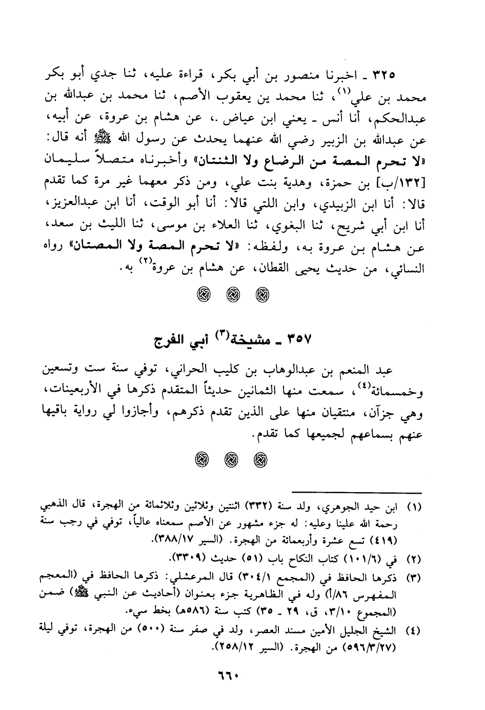 325 - أَخْبَرَنَا مَنْصُورُ بْنُ أَبِي بَكْرٍ، قِرَاءَةً عَلَيْهِ، ثنا جَدِّي أَبُو بَكْرٍ مُحَمَّدُ بْنُ عَلِيٍّ، ثنا مُحَمَّدُ بْنُ يَعْقُوبَ الأَصَمُّ، ثنا مُحَمَّدُ بْنُ عَبْدِ اللَّهِ بْنِ عَبْدِ الْحَكَمِ، أنا أَنَسٌ، يَعْنِي: ابْنَ عِيَاضٍ، عَنْ هِشَامِ بْنِ عُرْوَةَ، عَنْ أَبِيهِ، عَنْ عَبْدِ اللَّهِ بْنِ الزُّبَيْرِ، رَضِيَ اللَّهُ عَنْهُمَا، يُحَدِّثُ عَنْ رَسُولِ اللَّهِ، صَلَّى اللَّهُ عَلَيْهِ وَسَلَّمَ، أَنَّهُ قَالَ: " لا تُحَرَّمُ الْمَصَّةُ مِنَ الرَّضَاعِ وَلا الثِّنْتَانِ " وَأَخْبَرَنَاهُ مُتَّصِلا سُلَيْمَانُ بْنُ حَمْزَةَ، وَهَدِيَّةُ بِنْتُ عَلِيٍّ، وَمَنَ ذُكِرَ مَعَهُمَا غَيْرَ مَرَّةٍ كَمَا تَقَدَّمَ، قَالا: أنا ابْنُ الزُّبَيْدِيِّ، وَابْنُ اللَّتِّيِّ، قَالا: أنا أَبُو الْوَقْتِ، أنا ابْنُ عَبْدِ الْعَزِيزِ، أنا ابْنُ أَبِي شُرَيْحٍ، ثنا الْبَغَوِيُّ، ثنا الْعَلاءُ بْنُ مُوسَى، ثنا اللَّيْثُ بْنُ سَعْدٍ، عَنْ هِشَامِ بْنِ عُرْوَةَ، بِهِ، وَلَفْظِهِ: " لا تُحَرَّمُ الْمَصَّةُ وَلا الْمَصَّتَانِ " رَوَاهُ النَّسَائِيُّ، مِنْ حَدِيثِ يَحْيَى الْقَطَّانِ، عَنْ هِشَامِ بْنِ عُرْوَةَ، بِهِ