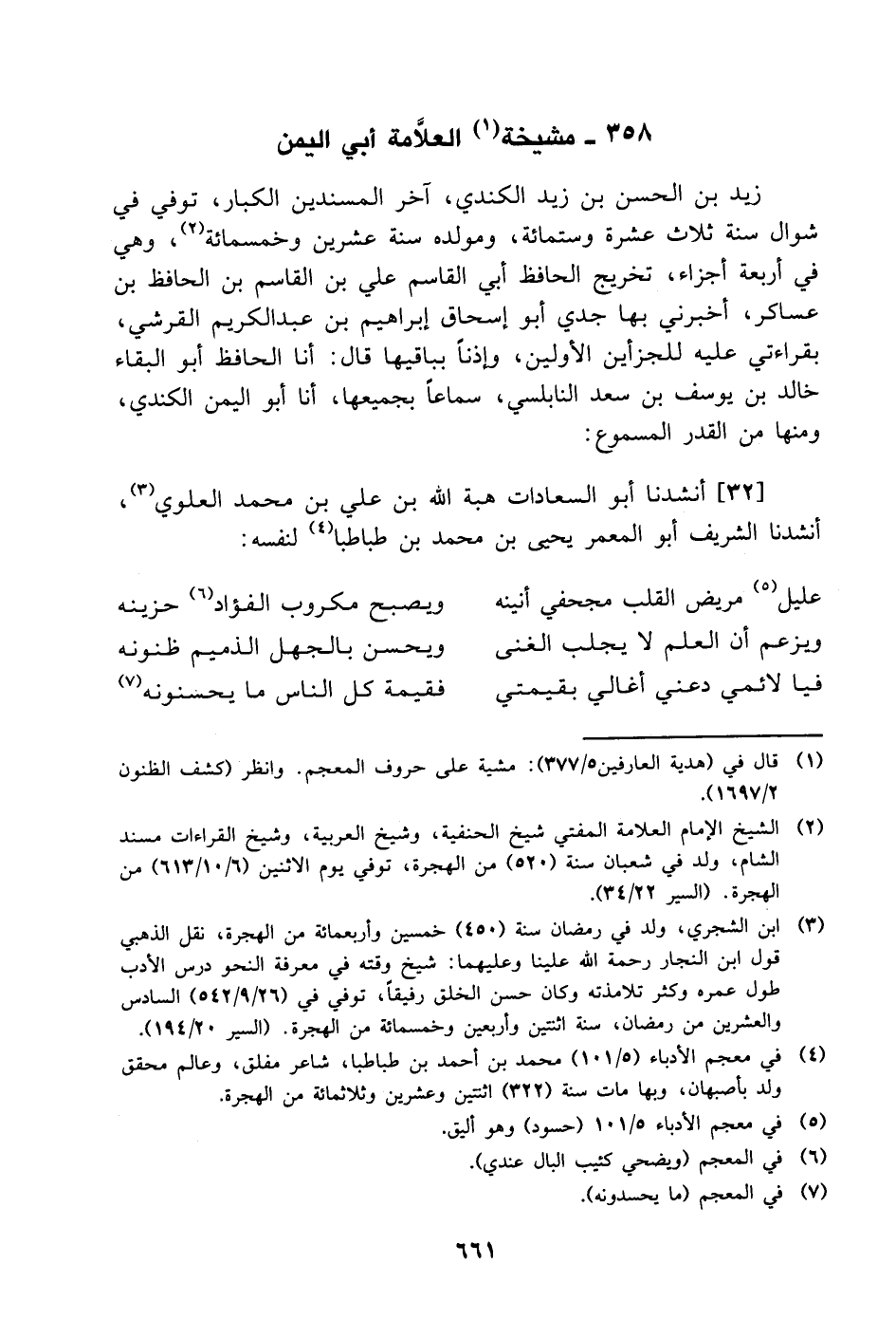 زيد بن الحسن بن زيد الكندي، آخر المسندين الكبار، توفي في شوال سنة ثلاث عشرة وست مائة، ومولده سنة عشرين وخمس مائة، وهي في أربعة أجزاء، تخريج الحافظ أبي القاسم علي بن القاسم ابن الحافظ ابن عساكر، أخبرني بها جدي أبو إسحاق إبراهيم بن عبد الكريم القرشي، بقراءتي عليه للجزأين الأولين، وإذنا بباقيها قال: أنا الحافظ أبو البقاء خالد بن يوسف بن سعد النابلسي، سماعا بجميعها، أنا أبو اليمن الكندي، ومنها من القدر المسموع: أنشدنا أبو السعادات هبة الله بن علي بن مُحَمَّد العلوي، أنشدنا الشريف أبو المعمر يحيى بن مُحَمَّد بن طباطبا لنفسه: