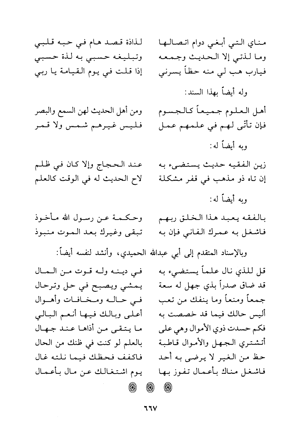وَمَا لَذَّتِي إِلا الْحَدِيثُ وَجَمْعُهُ ... وَتَبْلِيغُهُ حَسْبِي بِهِ لَذَّةٌ حَسْبِي