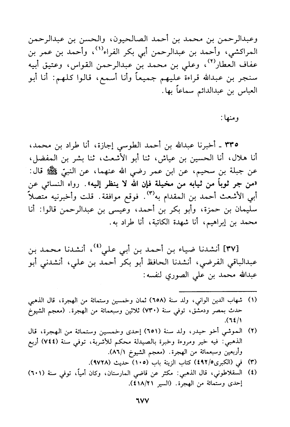 335 - أَخْبَرَنَا عَبْدُ اللَّهِ بْنُ أَحْمَدَ الطُّوسِيُّ، إِجَازَةً، أنا طِرَادُ بْنُ مُحَمَّدٍ، أنا هِلالٌ، أنا الْحُسَيْنُ بْنُ عَيَّاشٍ، ثنا أَبُو الأَشْعَثِ، ثنا بِشْرُ بْنُ الْمُفَضَّلِ، عَنْ جَبَلَةَ بْنِ سُحَيْمٍ، عَنِ ابْنِ عُمَرَ، رَضِيَ اللَّهُ عَنْهُمَا، عَنِ النَّبِيِّ، صَلَّى اللَّهُ عَلَيْهِ وَسَلَّمَ، قَالَ: " مَنْ جَرَّ ثَوْبًا مِنْ ثِيَابِهِ مِنْ مَخِيلَةٍ فَإِنَّ اللَّهَ لا يَنْظُرُ إِلَيْهِ " رَوَاهُ النَّسَائِيُّ، عَنْ أَبِي الأَشْعَثِ أَحْمَدَ بْنِ الْمِقْدَامِ، بِهِ فَوَقَعَ مُوَافَقَةً قُلْتُ: وَأَخْبَرَنِيهِ مُتَّصِلا سُلَيْمَانُ بْنُ حَمْزَةَ، وَأَبُو بَكْرِ بْنُ أَحْمَدَ، وَعِيسَى بْنُ عَبْدِ الرَّحْمَنِ، قَالُوا: أنا مُحَمَّدُ بْنُ إِبْرَاهِيمَ، أنا شُهْدَةُ الْكَاتِبَةُ، أنا طِرَادٌ، بِهِ