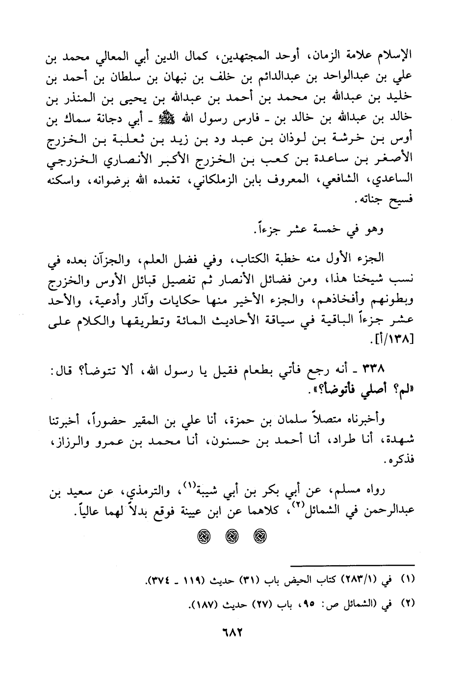 الإسلام علامة الزمان، أوحد المجتهدين، كمال الدين أبي المعالي مُحَمَّد بن علي بن عبد الواحد بن عبد الدائم بن خلف بن نبهان بن سلطان بن أحمد بن خليد بن عبد الله بن مُحَمَّد بن أحمد بن عبد الله بن يحيى بن المنذر بن خالد بن عبد الله بن خالد ابن فارس رسول الله، صَلَّى اللَّهُ عَلَيْهِ وَسَلَّمَ أبي دجانة سماك بن أوس بن خرشة بن لوذان بن عبد ود بن زيد بن ثعلبة بن الخزرج الأصغر بن ساعدة بن كعب بن الخزرج الأكبر الأنصاري الخزرجي الساعدي، الشافعي، المعروف بابن الزملكاني، تغمده الله برضوانه، واسكنه فسيح جناته وهو في خمسة عشر جزءا الجزء الأول منه خطبة الكتاب، وفي فضل العلم، والجزآن بعده في نسب شيخنا هذا، ومن فضائل الأنصار ثم تفصيل قبائل الأوس والخزرج وبطونهم وأفخاذهم، والجزء الأخير منها حكايات وآثار وأدعية، والأحد عشر جزءا الباقية في سياقة الأحاديث المائة وتطريقها والكلام على