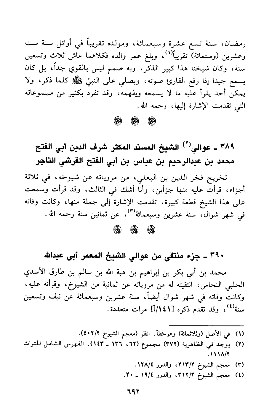 محمد بن أبي بكر بن إبراهيم بن هبة الله بن سالم بن طارق الأسدي الحلبي النحاس، انتقيته له من مروياته عن ثمانية من الشيوخ، وقرأته عليه، وكانت وفاته في شهر شوال أيضا، سنة عشرين وسبع مائة عن نيف وتسعين سنة، وقد تقدم ذكره مرات متعددة