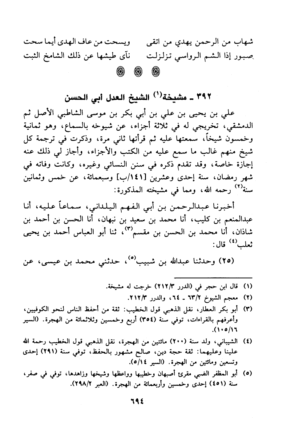 علي بن يحيى بن علي بن أبي بكر بن موسى الشاطبي الأصل ثم الدمشقي، تخريجي له في ثلاثة أجزاء، عن شيوخه بالسماع، وهو ثمانية وخمسون شيخا، سمعتها عليه ثم قرأتها ثاني مرة، وذكرت في ترجمة كل شيخ منهم غالب ما سمع عليه من الكتب والأجزاء، وأجاز لي ذلك عنه إجازة خاصة، وقد تقدم ذكره في سنن النسائي وغيره، وكانت وفاته في شهر رمضان، سنة إحدى وعشرين وسبع مائة، عن خمس وثمانين سنة رحمه الله ومما في مشيخته المذكورة: أخبرنا عبد الرحمن بن أبي الفهم اليلداني، سماعا عليه، أنا عبد المنعم بن كليب، أنا مُحَمَّد بن سعيد بن نبهان، أنا الحسن بن أحمد بن شاذان، أنا مُحَمَّد بن الحسن بن مقسم، ثنا أبو العباس أحمد بن يحيى ثعلب قال: وحدثنا عبد الله بن شبيب، حدثني مُحَمَّد بن عيسى، عن