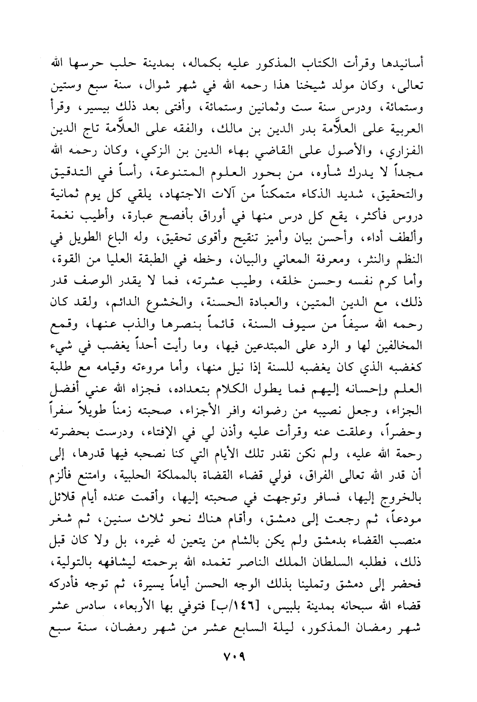 أسانيدها وقرأت الكتاب المذكور عليه بكماله، بمدينة حلب حرسها الله تعالى، وكان مولد شيخنا هذا رحمه الله في شهر شوال، سنة سبع وستين وست مائة، ودرس سنة ست وثمانين وست مائة، وأفتى بعد ذلك بيسير، وقرأ العربية على العلامة بدر الدين بن مالك، والفقه على العلامة تاج الدين الفزاري، والأصول
