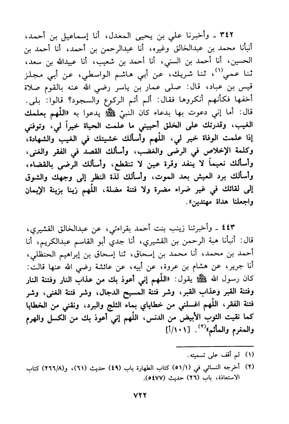 242 - وَأَخْبَرَنَا عَلِيُّ بْنُ يَحْيَى الْمُعَدَّلُ، أنا إِسْمَاعِيلُ بْنُ أَحْمَدَ، أَنْبَأَنَا مُحَمَّدُ بْنُ عَبْدِ الْخَالِقِ، وَغَيْرُهُ، أنا عَبْدُ الرَّحْمَنِ بْنُ أَحْمَدَ، أنا أَحْمَدُ بْنُ الْحُسَيْنِ، أنا أَحْمَدُ بْنُ السُّنِّيِّ، أنا أَحْمَدُ بْنُ شُعَيْبٍ، أنا عُبَيْدُ اللَّهِ بْنُ سَعْدٍ، ثنا عَمِّي، ثنا شَرِيكٌ، عَنْ أَبِي هَاشِمٍ الْوَاسِطِيِّ، عَنْ أَبِي مِجْلَزٍ قَيْسِ بْنِ عَبَّادٍ، قَالَ: صَلَّى عَمَّارُ بْنُ يَاسِرٍ، رَضِيَ اللَّهُ عَنْهُ، بِالْقَوْمِ صَلاةً أَخَفَّهَا، فَكَأَنَّهُمْ أَنْكَرُوهَا، فَقَالَ: أَلَمْ أُتِمَّ الرُّكُوعَ وَالسُّجُودَ؟ قَالُوا: بَلَى، قَالَ: أَمَا إِنِّي دَعَوْتُ بِهَا بِدُعَاءٍ كَانَ النَّبِيُّ، صَلَّى اللَّهُ عَلَيْهِ وَسَلَّمَ، يَدْعُو بِهِ: " اللَّهُمَّ بِعِلْمِكَ الْغَيْبَ، وَقُدْرَتِكَ عَلَى الْخَلْقِ أَحْيِنِي مَا عَلِمْتَ الْحَيَاةَ خَيْرًا لِي، وَتَوَفَّنِي إِذَا عَلِمْتَ الْوَفَاةَ خَيْرًا لِي، اللَّهُمَّ وَأَسْأَلُكَ خَشْيَتَكَ فِي الْغَيْبِ وَالشَّهَادَةِ، وَكَلِمَةَ الإِخْلاصِ فِي الرِّضَا وَالْغَضَبِ، وَأَسْأَلُكَ الْقَصْدَ فِي الْفَقْرِ وَالْغِنَى، وَأَسْأَلُكَ نَعِيمًا لا يَنْفَدُ، وَقُرَّةَ عَيْنٍ لا تَنْقَطِعُ، وَأَسْأَلُكَ الرِّضَا بِالْقَضَاءِ، وَأَسْأَلُكَ بِرَدِّ الْعَيْشِ بَعْدَ الْمَوْتِ، وَأَسْأَلُكَ لَذَّةَ النَّظَرِ إِلَى وَجْهِكَ، وَالشَّوْقَ إِلَى لِقَائِكَ فِي غَيْرِ ضَرَّاءَ مُضِرَّةٍ وَلا فِتْنَةٍ مُضِلَّةٍ، اللَّهُمَّ زَيِّنَّا بِزِينَةِ الإِيمَانِ وَاجْعَلْنَا هُدَاةً مُهْتَدِينَ "