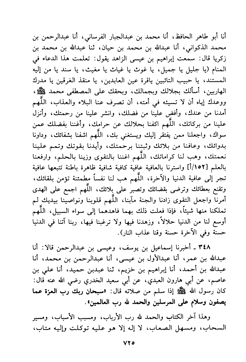 أنا أَبُو طَاهِرٍ الْحَافِظُ، أنا مُحَمَّدُ بْنُ عَبْدِ الْجَبَّارِ الْفُرْسَانِيُّ، أنا عَبْدُ الرَّحْمَنِ بْنُ مُحَمَّدٍ الذَّكْوَانِيُّ، أنا عَبْدُ اللَّهِ بْنُ مُحَمَّدِ بْنِ حَيَّانَ، ثنا عَبْدُ اللَّهِ بْنُ مُحَمَّدِ بْنِ زَكَرِيَّا، قَالَ: سَمِعْتُ إِبْرَاهِيمَ بْنِ عِيسَى الزَّاهِدُ، يَقُولُ: تَعَلَّمْتُ هَذَا الدُّعَاءَ فِي الْمَنَامِ: يَا جَلِيلُ يَا جَمِيلُ، يَا غَوْثُ يَا غِيَاثُ يَا مُغِيثُ، يَا سَنَدُ يَا مَنْ إِلَيْهِ الْمُسْتَنَدُ، يَا حَبِيبَ التَّائِبِينَ يَا قُرَّةَ عَيْنِ الْعَابِدِينَ، يَا مُنْقِذَ الْغَرِقِينَ يَا مُدْرِكَ الْهَارِبِينَ، أَسْأَلُكَ بِجَلالِكَ وَبِجَمَالِكَ، وَبِحَقِّكَ عَلَى الْمُصْطَفَى مُحَمَّدٍ، صَلَّى اللَّهُ عَلَيْهِ وَسَلَّمَ، وَوَعْدِكَ إِيَّاهُ أَنْ لا تُسِيئَهُ فِي أُمَّتِهِ، أَنْ تُصْرِفَ عَنَّا الْبَلاءَ وَالْعَذَابَ، اللَّهُمَّ أَمِدَّنَا مِنْ عِنْدِكَ، وَأَفِضْ عَلَيْنَا مِنْ فَضْلِكَ، وَانْشُرْ عَلَيْنَا مِنْ رَحْمَتِكَ، وَأَنْزِلْ عَلَيْنَا مِنْ بَرَكَاتِكَ، اللَّهُمَّ اكْفِنَا بِحَلالِكَ عَنْ حَرَامِكَ، وَأَغْنِنَا بِفَضْلِكَ عَمَّنْ سِوَاكَ، وَاجْعَلْنَا مِمَّنْ يَفْتَقِرُ إِلَيْكَ وَيَسْتَغْنِي بِكَ، اللَّهُمَّ اشْفِنَا بِشِفَائِكَ، وَدَاوِنَا بِدَوَائِكَ، وَعَافِنَا مِنْ بَلائِكَ، وَثَبِّتْنَا بِرَحْمَتِكَ، وَأَيِّدْنَا بِقُوَّتِكَ، وَتَمِّمْ عَلَيْنَا نِعْمَتَكَ، وَهَبْ لَنَا كَرَامَاتِكَ، اللَّهُمَّ اغْنِنَا بِالتَّقْوَى، وَزَيِّنَّا بِالْحِلْمِ، وَارْفَعْنَا بِالْعِلْمِ، وَاسْتُرْنَا بِالْعَافِيَةِ عَافِيَةٍ كَافِيَةٍ شَافِيَةٍ ظَاهِرَةٍ بَاطِنَةٍ، تَتْبَعُهَا عَافِيَةٌ تُجَرُّ إِلَى عَافِيَةِ الدُّنْيَا وَالآخِرَةِ، اللَّهُمَّ هَبْ لَنَا نَفْسًا مُطْمَئِنَّةً، تُؤْمِنُ بِلِقَائِكَ، وَتَقْنَعُ بِعَطَائِكَ، وَتَرْضَى بِقَضَائِكَ، وَتَصْبِرُ عَلَى بَلائِكَ، اللَّهُمَّ اجْمَعْ عَلَى الْهُدَى أَمْرَنَا، وَاجْعَلِ التَّقْوَى زَادَنَا وَالْجَنَّةَ مَآبَنَا، اللَّهُمَّ قُلُوبُنَا وَنَوَاصِينَا بِيَدَيْكَ، لَمْ تُمَلِّكْنَا مِنْهَا شَيْئًا، فَإِذَا فَعَلْتَ ذَلِكَ بِهِمَا فَاهْدِهِمَا إِلَى سَوَاءِ السَّبِيلِ، اللَّهُمَّ أَوْسِعْ لَنَا مِنَ الدُّنْيَا حَلالا، وَزَهِّدْنَا فِيهَا، وَلا تُرَغِّبْنَا فِيهَا، رَبَّنَا آتِنَا فِي الدُّنْيَا حَسَنَةً وَفِي الآخِرَةِ حَسَنَةً، وَقِنَا عَذَابَ النَّارِ