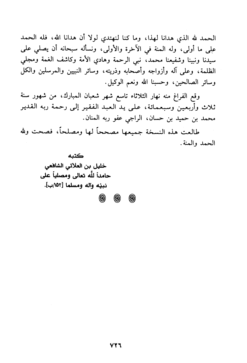 الحمد لله الذي هدانا لهذا، وما كنا لنهتدي لولا أن هدانا الله، فله الحمد على ما أولى، وله المنة في الآخرة والأولى، ونسأله سبحانه أن يصلي على سيدنا ونبينا وشفيعنا محمد، نبي الرحمة، وهادي الأمة، وكاشف الغمة، ومجلي الظلمة، وعلى آله وأزواجه وذريته، وسائر النبيين والمرسلين والكل وسائر الصالحين، وحسبنا الله ونعم الوكيل وقع الفراغ منه نهار الثلاثاء تاسع شهر شعبان المبارك، من شهور سنة ثلاث وأربعين وسبع مائة، على يد العبد الفقير إلى رحمة ربه القدير
