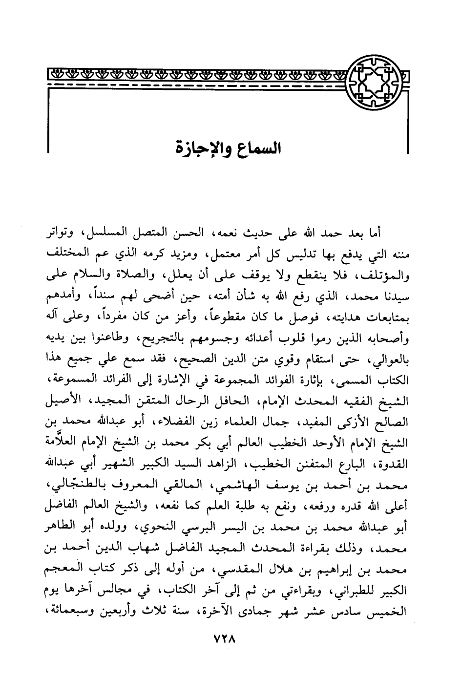 أما بعد حمد الله على حديث نعمه، الحسن المتصل المسلسل، وتواتر مننه التي يدفع بها تدليس كل أمر معتمل، ومزيد كرمه الذي عم المختلف والمؤتلف، فلا ينقطع ولا يوقف على أن يعلل، والصلاة والسلام على سيدنا محمد، الذي رفع الله به شأن أمته، حين أضحى لهم سنداً، وأمدهم بمتابعات هدايته، فوصل ما كان مقطوعاً، وأعز من كان مفرداً، وعلى آله وأصحابه الذين رموا قلوب أعدائه وجسومهم بالتجريح، وطاعنوا بين يديه