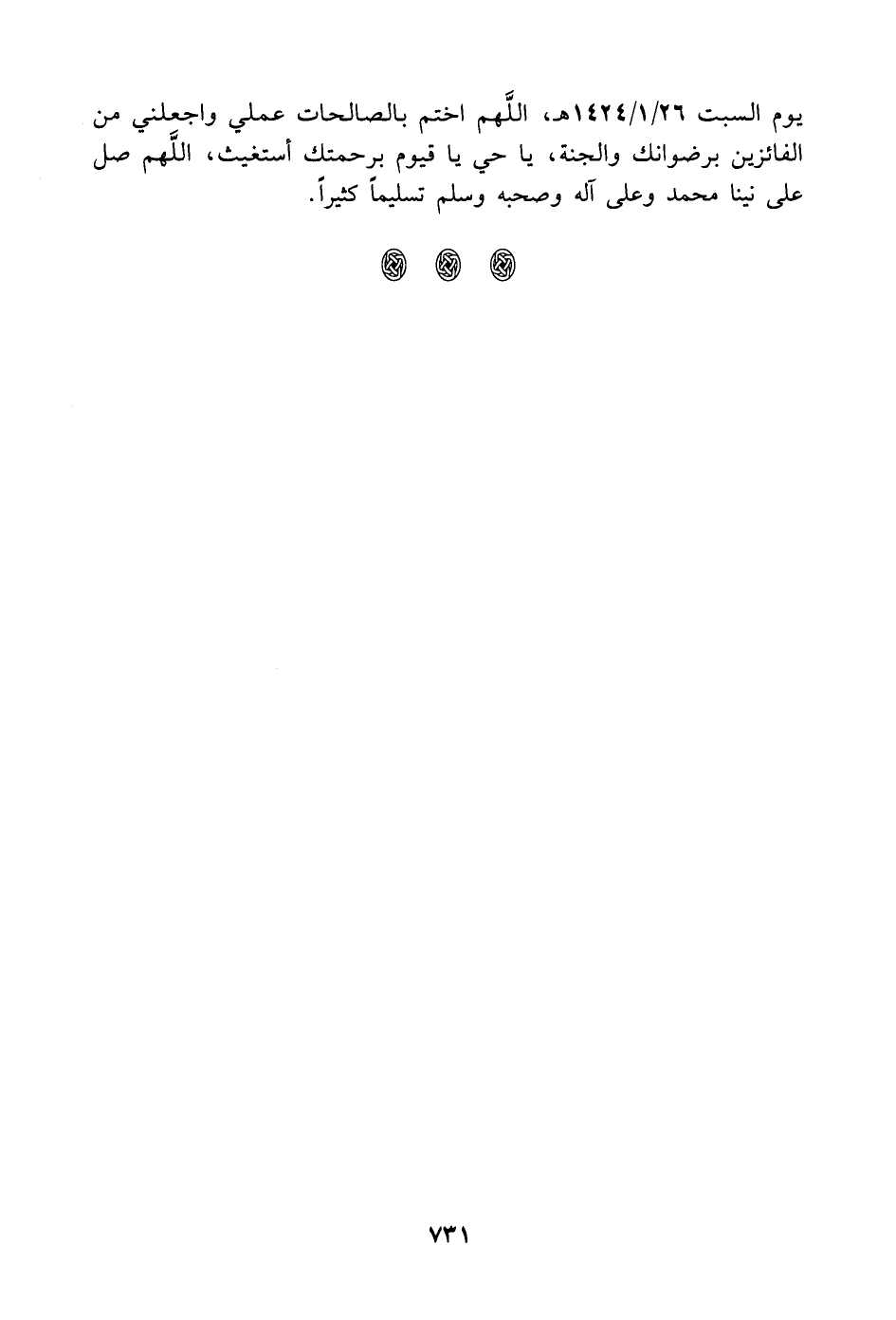 يوم السبت 26/1/1424 هـ، اللَّهم اختم بالصالحات عملي واجعلني من الفائزين برضوانك والجنة، يا حي يا قيوم برحمتك أستغيث، اللَّهم صل على نينا محمد وعلى آله وصحبه وسلم تسليماً كثيراً.