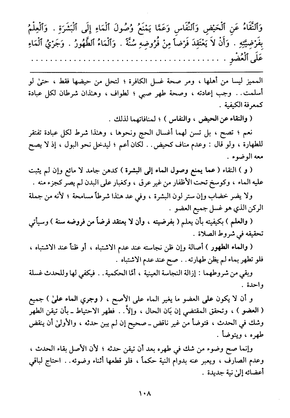 (و) النقاء (عما يمنع وصول الماء إلى البشرة) كدهن جامد لا مائع وإن لم يثبت عليه الماء، وكوسخ تحت الأظفار من غير عرق، وكغبار على البدن لم يصر كجزء منه.