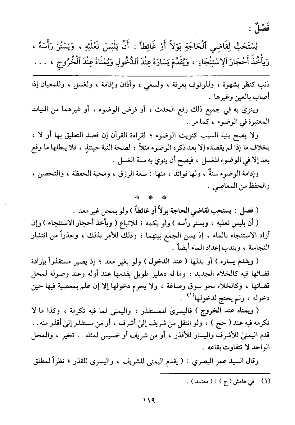 وقال السيد عمر البصري: (يقدم اليمنى للشريف، واليسرى للقذر؛ نظراً لمطلق