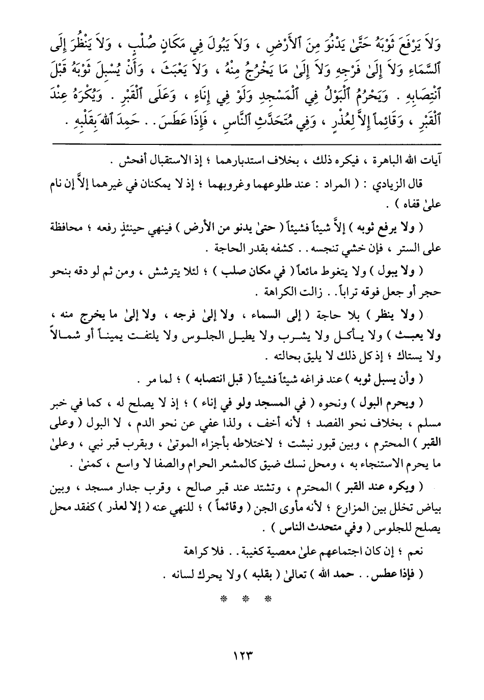 (ويحرم البول) ونحوه (في المسجد ولو في إناء)؛ إذ لا يصلح له، كما في خبر مسلم، بخلاف نحو الفصد؛ لأنه اخف، ولذا عفي عن نحو الدم، لا البول (وعلى القبر) المحترم، وبين قبور نبشت؛ لاختلاطه بأجزاء الموتى، وبقرب قبر نبي، وعلى ما يحرم الاستنجاء به، ومحل نسك ضيق كالمشعر الحرام والصفا لا واسع، كمنى.