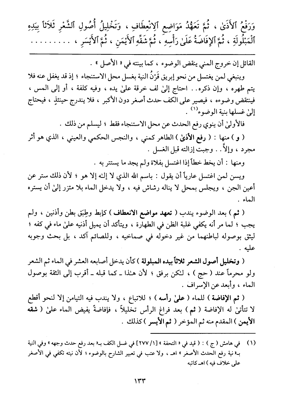 وينبغي لمن يغتسل من نحو إبريق قَرنُ النية بغسل محل الاستنجاء؛ إذ قد يغفل عنه فلا يتم طهره، وإن ذكره .. احتاج إلى لف خرقة على يده، وفيه كلفة، أو إلى المس، فينتقض وضوءه، فيصير على الكف حدث أصغر دون الأكبر، فلا يندرج حينئذٍ، فيحتاج إلى غسلها بنية الوضوء.
