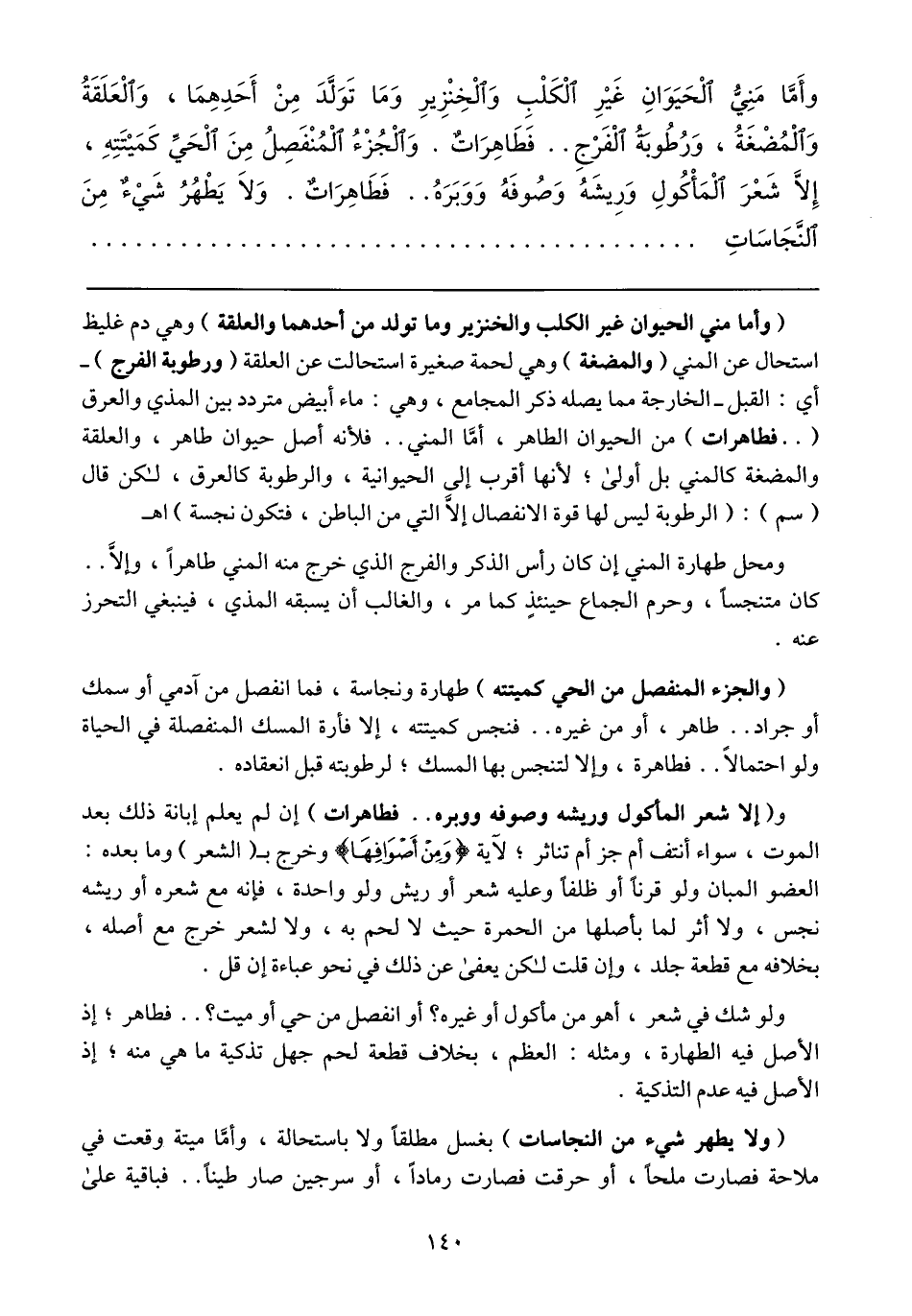 (وأما مني الحيوان غير الكلب والخنزير وما تولد من أحدهما والعلقة) وهي دم غليظ استحال عن المني (والمضغة) وهي لحمة صغيرة استحالت من العلقة (ورطوبة الفرج) -أي: القبل- الخارجة مما يصله ذكر المجامع، وهي: ماء أبيض متردد بين المذي والعرق ( .. فطاهرات) من الحيوان الطاهر، أمَّا المني .. فلأنه أصل حيوان طاهر، والعلقة والمضغة كالمني بل أولى؛ لأنها أقرب إلى الحيوانية، والرطوبة كالعرق، لكن قال (سم): (الرطوبة ليس لها قوة الانفصال إلاَّ التي من الباطن، فتكون نجسة) اهـ
