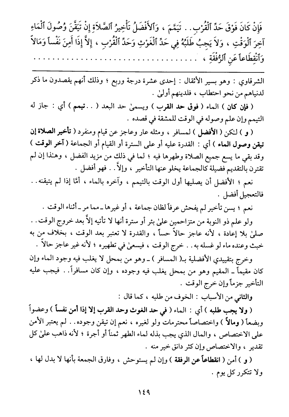 (و) لكن (الأفضل) لمسافر، ومثله عار وعاجز عن قيام ومنفرد (تأخير الصلاة إن تيقن وصول الماء) أي: القدرة عليه أو على السترة أو القيام أو الجماعة (آخر الوقت) وقد بقي ما يسع جميع الصلاة وطهرها فيه؛ لما في ذلك من مزيد الفضل، وهذا إن لم تقترن بالتقديم فضيلة كالجماعة يخلو عنها التأخير، وإلاَّ .. فهو أفضل.