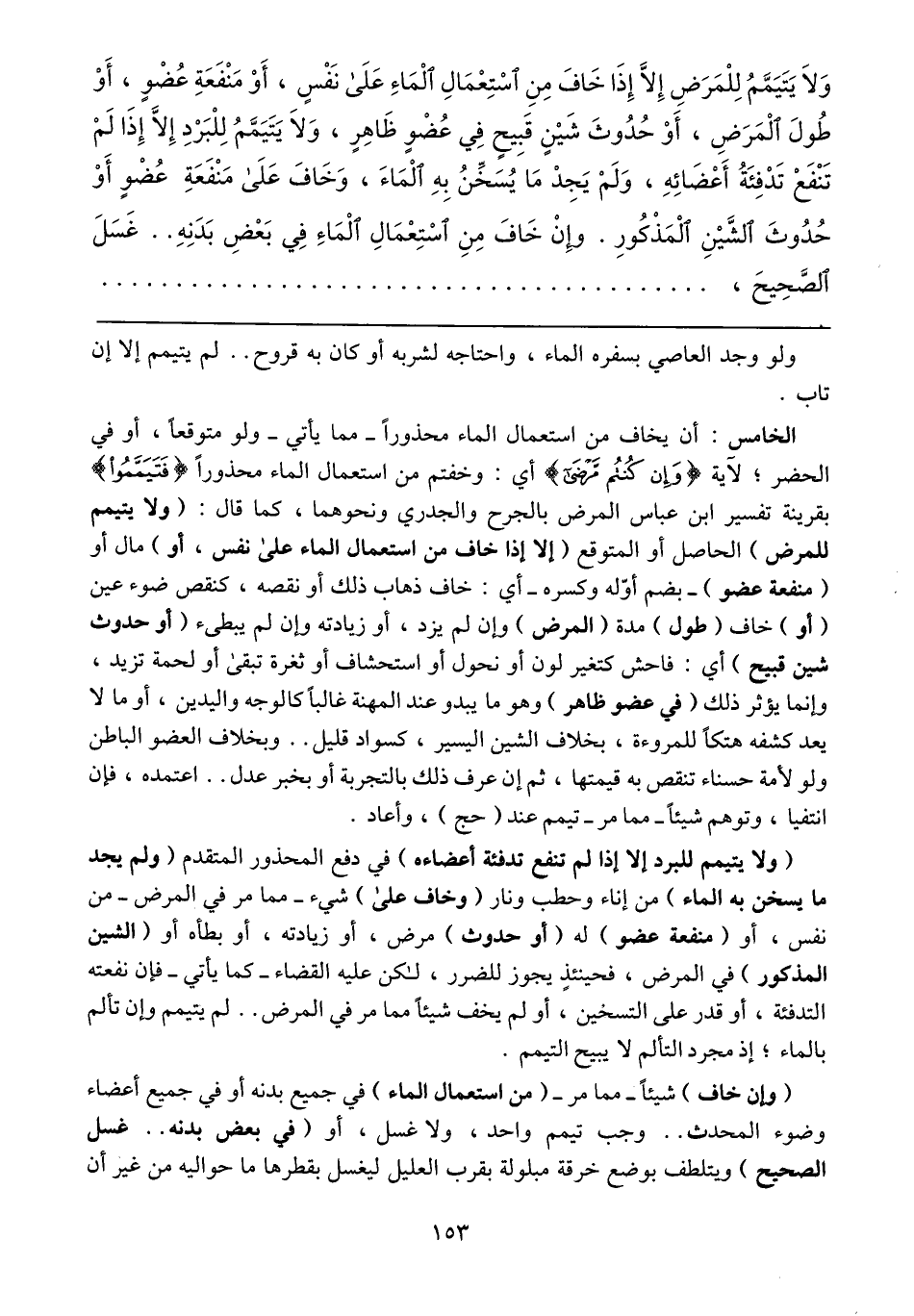 والخامس: أن يخاف من استعمال الماء محذوراً -مما يأتي- ولو متوقعاً، أو في الحضر؛ لآية (وَإِنْ كُنتُمْ مَرْضَى) [النساء: 43] أي: وخفتم من استعمال الماء محذوراً (فَتَيَمَّمُوا) [النساء: 43] بقرينة تفسير ابن عباس المرض بالجرح والجدري ونحوهما، كما قال: (ولا يتيمم للمرض) الحاصل أو المتوقع (إلا إذا خاف من استعمال الماء على نفس، أو) مال أو (منفعة عضو) -بضم أوّله وكسره- أي: خاف ذهاب ذلك أو نقصه، كنقض ضوء عين (أو) خاف (طول) مدة (المرض) وإن لم يزد، أو زيادته وإن لم يبطئ (أو حدوث شين قبيح) أي: فاحش كتغير لون أو نحول أو استحشاف أو ثغرة تبقى أو لحمة تزيد، وإنما يؤثر ذلك (في عضو ظاهر) وهو ما يبدو عند المهنة غالباً كالوجه واليدين، أو ما لا يعد كشفه هتكاً للمروءة، بخلاف الشين اليسير، كسواد قليل .. وبخلاف العضو الباطن ولو لأمة حسناء تنقص به قيمتها، ثم إن عرف ذلك بالتجربة أو بخبر عدل .. اعتمده، فإن انتفيا، وتوهم شيئا -مما مر- تيمم عند (حج)، وأعاد.