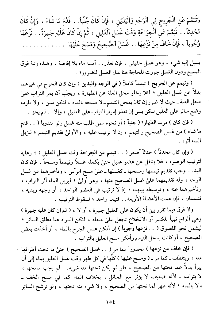 ولا فرق فيما تقرر بين أن يكون على العليل جبيرة، أو لا، (ثم إن كان عليه جبيرة) وهي ألواح تهيأ للكسر أو الانخلاع تجعل على محله، لكن المراد هنا مطلق الساتر؛ ليشمل نحو اللصوق ( .. نزعها وجوباً) إن أمكن غسل الجرح بالماء، أو أخذت بعض الصحيح، أو كانت بمحل التيمم وأمكن مسح العليل بالتراب.