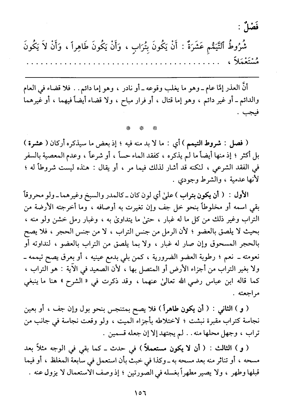 الأول: (أن يكون بتراب) على أي لون كان -كالمدر والسبخ وغيرهما- ولو محروقاً بقي اسمه أو مخلوطاً بنحو خل جف وإن تغيرت به أوصافه، وما أخرجته الأرضة من التراب وغير ذلك من كل ما له غبار، حتى ما يتداوى به، وغبار رمل خشن ولو منه، بحيث لا يلصق بالعضو؛ لأن الرمل من جنس التراب، لا من جنس الحجر، فلا يصح بالحجر المسحوق وإن صار له غبار، ولا بما يلصق من التراب بالعضو، لنداوته أو نعومته -نعم؛ رطوبة العضو الضرورية، كمن بلي بدمع عينيه، أو بعرق يصح تيممه- ولا بغير التراب من أجزاء الأرض أو المتصل بها؛ لأن الصعيد في الآية: هو التراب، كما قاله ابن عباس رضي الله تعالى عنهما، وقد ذكرت في "الشرح" هنا ما ينبغي مراجعته.