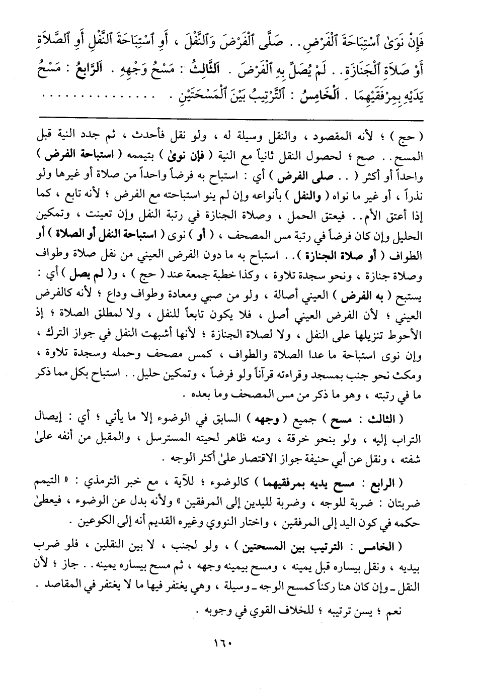 (حج)؛ لأنه المقصود، والنقل وسيلة له، ولو نقل فأحدث، ثم جدد النية قبل المسح .. صح؛ لحصول النقل ثانياً مع النية (فإن نوى) بتيممه (استباحة الفرض) واحداً أو أكثر ( .. صلى الفرض) أي: استباح به فرضاً واحداً من صلاة أو غيرها ولو نذراً، أو غير ما نواه (والنفل) بأنواعه وإن لم ينو استباحته مع الفرض؛ لأنه تابع، كما إذا أعتق الأم .. فيعتق الحمل، وصلاة الجنازة في رتبة النفل وإن تعينت، وتمكين الحليل وإن كان فرضاً في رتبة مس المصحف، (أو) نوى (استباحة النفل أو الصلاة) أو الطواف (أو صلاة الجنازة) .. استباح به ما دون الفرض العيني من نفل صلاة وطواف وصلاة جنازة، ونحو سجدة تلاوة، وكذا خطبة جمعة عند (حج)، و (لم يصل) أي: يستبح (به الفرض) العيني أصالة، ولو من صبي ومعادة وطواف وداع؛ لأنه كالفرض العيني؛ لأن الفرض العيني أصل، فلا يكون تابعاً للنفل، ولا لمطلق الصلاة؛ إذ الأحوط تنزيلها على النفل، ولا لصلاة الجنازة؛ لأنها اشبهت النفل في جواز الترك، وإن نوى استباحة ما عدا الصلاة والطواف، كمس مصحف وحمله وسجدة تلاوة، ومكث نحو جنب بمسجد وقراءته قرآناً ولو فرضاً، وتمكين حليل .. استباح بكل مما ذكر ما في رتبته، وهو ما ذكر من مس المصحف وما بعده.