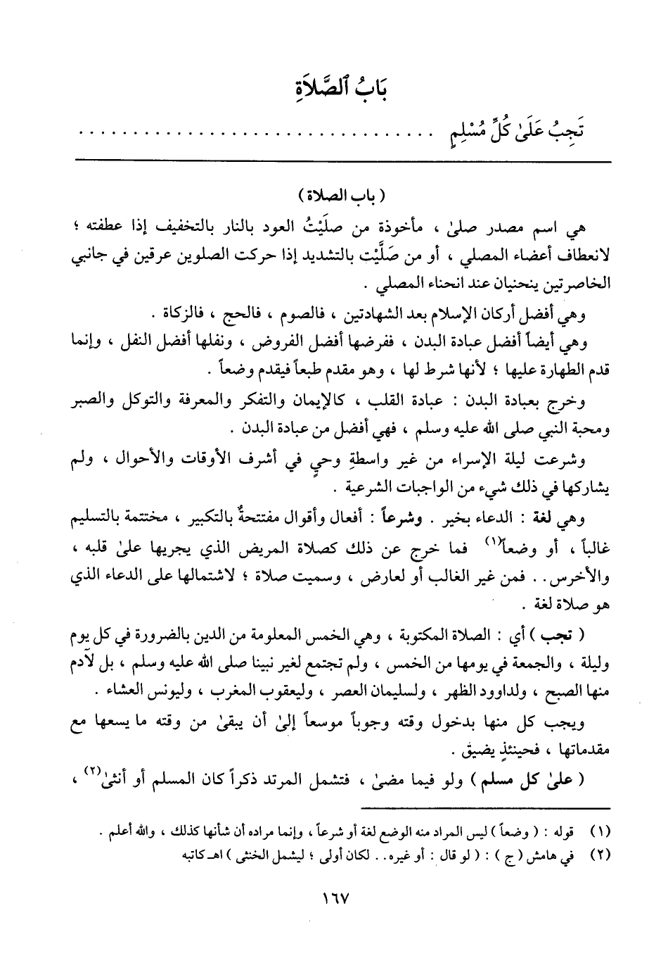 وهي لغة: الدعاء بخير. وشرعاً: أفعال وأقوال مفتتحةٌ بالتكبير، مختتمة بالتسليم غالباً، أو وضعاً فما خرج عن ذلك كصلاة المريض الذي يجريها على قلبه، والأخرس .. فمن غير الغالب أو لعارض، وسميت صلاة؛ لاشتمالها على الدعاء الذي هو صلاة لغة.
