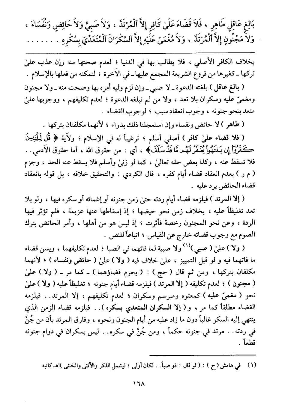 (ولا) على (صبي) ولا صبية لما فاتهما في الصبا؛ لعدم تكليفهما، ويسن قضاء ما فاتهما فيه ولو قبل التميز، على خلاف فيه (ولا) على (حائض ونفساء)؛ لأنهما مكلفان بتركها، ومن ثم قال (حج): (يحرم قضاؤهما) -كما مر- (ولا) على (مجنون)؛ لعدم تكليفه (إلا المرتد) فيلزمه قضاء أيام جنونه؛ تغليظاً عليه (ولا) على نحو (مغمىً عليه) كمعتوه ومبرسم وسكران؛ لعدم تكليفهم، إلا المرتد .. فيلزمه القضاء مطلقاً كما مر، و (إلا السكران المتعدى بسكره) .. فيلزمه قضاء الزمن الذي ينتهي إليه السكر غالباً دون ما زاد عليه من أيام الجنون ونحوه، وفارق المرتد بأن من جُنَّ في ردته .. مرتد في جنونه حكماً، ومن جُنَّ في سكره .. ليس بسكران في دوام جنونه قطعاً.