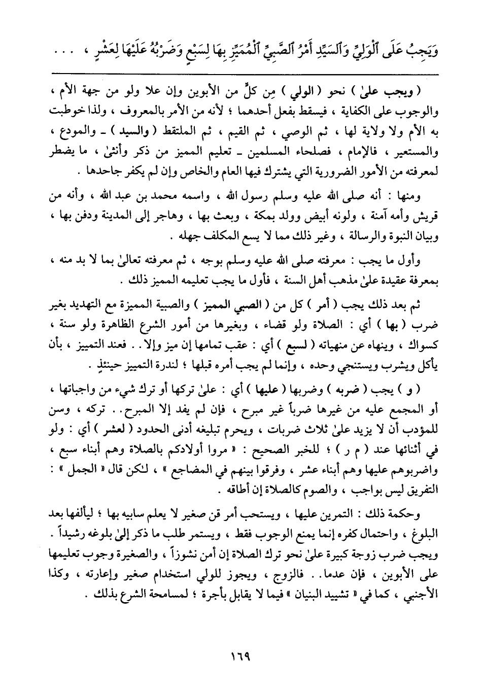 (ويجب على) نحو (الولي) من كلٍّ من الأبوين وإن علا ولو من جهة الأم، والوجوب على الكفاية، فيسقط بفعل أحدهما؛ لأنه من الأمر بالمعروف، ولذا خوطبت به الأم ولا ولاية لها، ثم الوصي، ثم القيم، ثم الملتقط (والسيد) -والمودع، والمستعير، فالإمام، فصلحاء المسلمين- تعليم المميز من ذكر وأنثى، ما يضطر لمعرفته من الأمور الضرورية التي يشترك فيها العام والخاص وإن لم يكفر جاحدها.