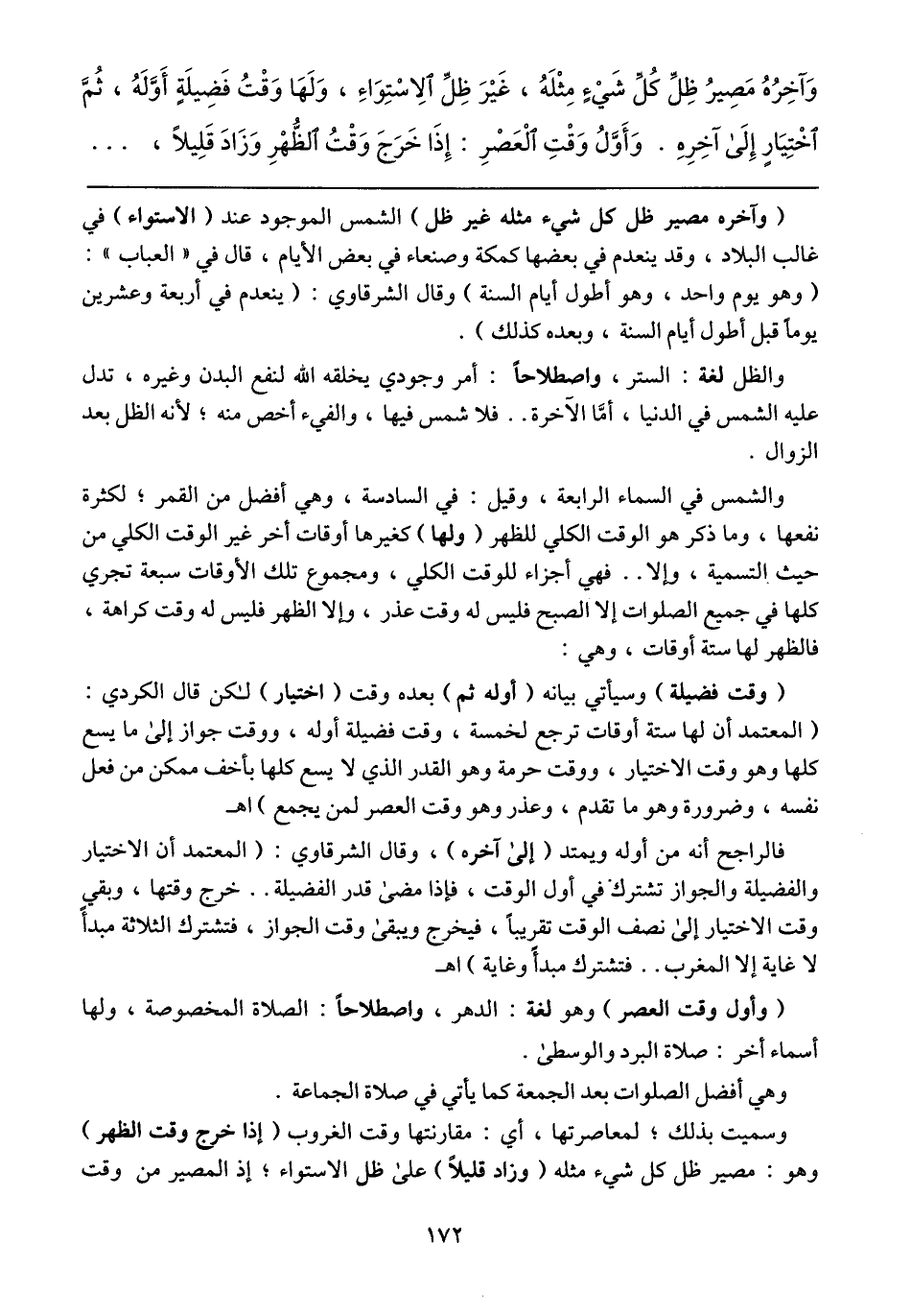 (وآخره مصير ظل كل شيء مثله غير ظل) الشمس الموجود عند (الاستواء) في غالب البلاد، وقد ينعدم في بعضها كمكة وصنعاء في بعض الأيام، قال في "العباب": (وهو يوم واحد، وهو أطول أيام السنة) وقال الشرقاوي: (ينعدم في أربعة وعشرين يوماً قبل أطول أيام السنة، وبعده كذلك).