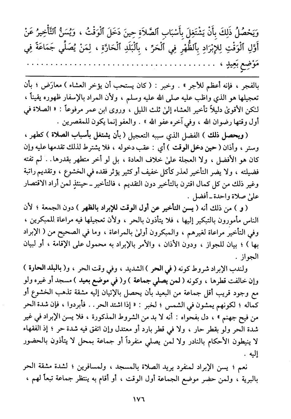 ولندب الإبراد شروط كونه (في الحر) الشديد، وفي وقت الحر، و (بالبلد الحارة) وإن خالفت قطرها، وكونه (لمن يصلي جماعة) و (في موضع بعيد) مسجد أو غيره ولو مع وجود قريب أقل جماعة من البعيد بأن يحصل بالإتيان إليه مشقة تذهب الخشوع أو كماله؛ لكونهم يمشون في الشمس؛ لخبر: "إذا اشتد الحر .. فأبردوا، فإن شدة الحر من فيح جهنم"، دل بفحواه: أنه لابد من الشروط المذكورة، فلا يسن الإبراد في غير شدة الحر ولو بقطر حار، ولا في قطر بارد أو معتدل وإن اتفق فيه شدة الحر؛ إذ الفقهاء لا ينيطون الأحكام بالنادر ولا لمن يصلي منفرداً أو جماعة بمحل لا يتأذون بالحضور إليه.