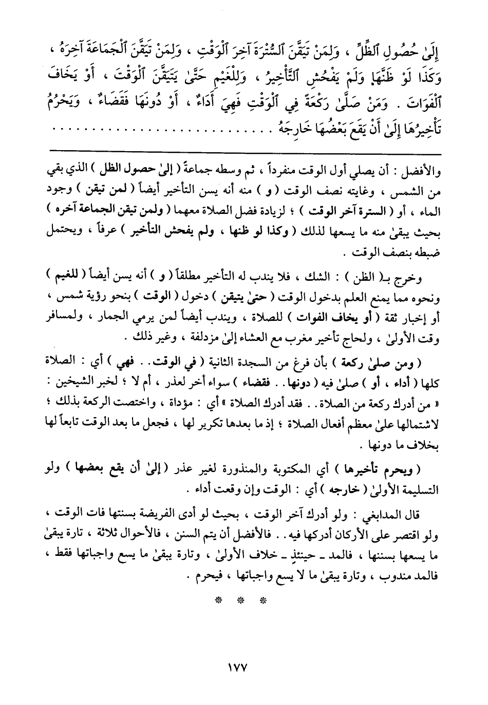 قال المدابغي: ولو أدرك آخر الوقت، بحيث لو أدى الفريضة بسنتها فات الوقت، ولو اقتصر على الأركان أدركها فيه .. فالأفضل أن يتم السنن، فالأحوال ثلاثة، تارة يبقي ما يسعها بسننها، فالمد -حينئذٍ- خلاف الأولى، وتارة يبقي ما يسع واجباتها فقط، فالمد مندوب، وتارة يبقي ما لايسع واجباتها، فيحرم.